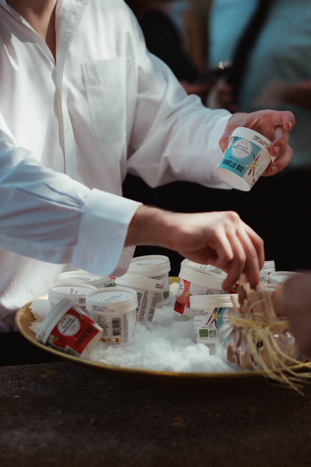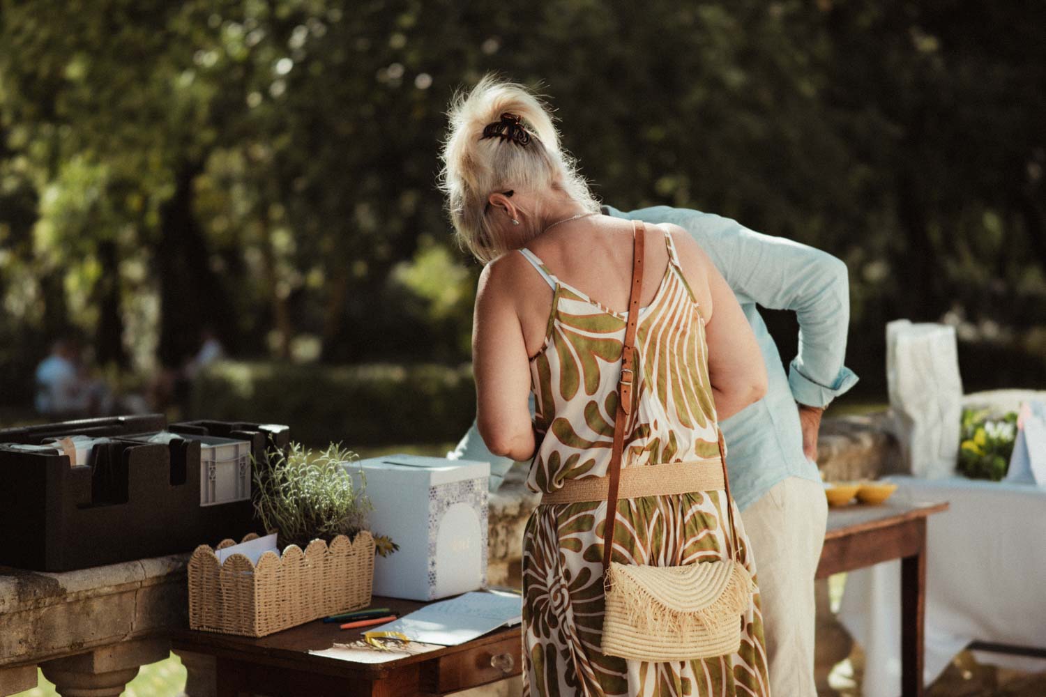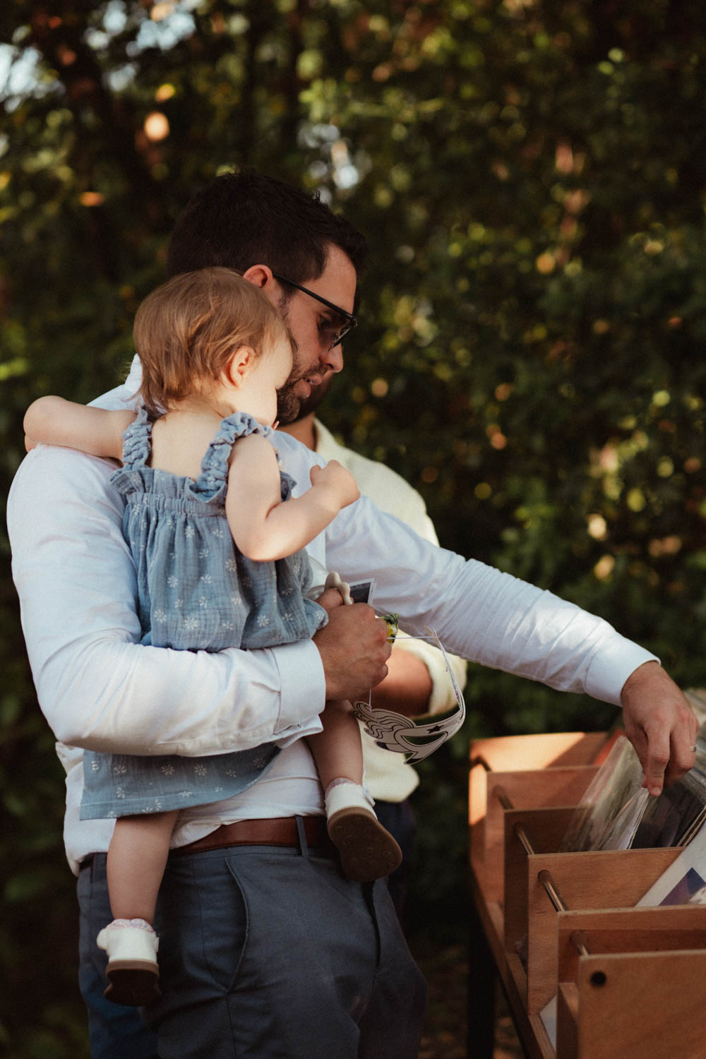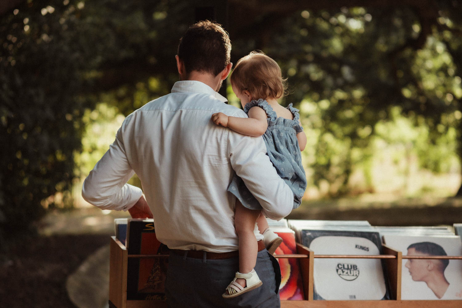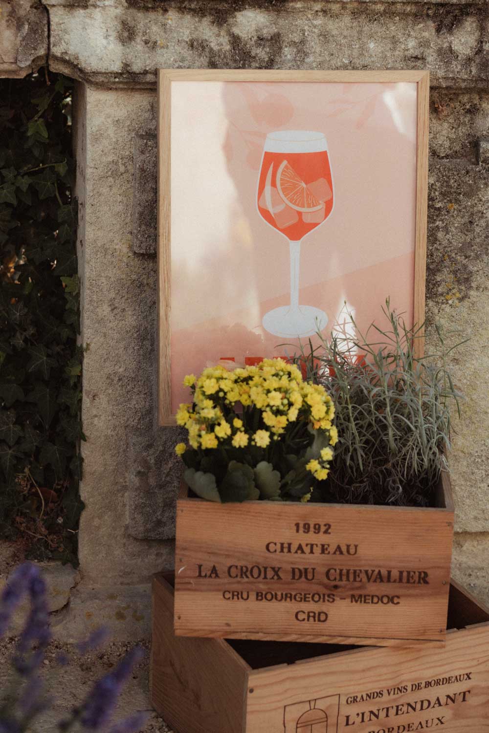 Les cérémonies se sont déroulées quant à elles à la mairie et à l’église de St Georges d’Orques, près de Montpellier. Des glaces et rafraîchissements attendaient les invités près d’un joli pigeonnier et d’un grand tilleul, une fois de retour sur le domaine. Les mariés avaient aussi prévu des bars à spritz et à vinyles pour le cocktail, ainsi que différentes animations : photobooth, bar à tattoos, un medley dansé par les filles, un jeu du bouquet original (sous forme de boîte en verre à décadenasser avec la bonne clé) ainsi qu’une sorte de “qui est qui” à partir d’une collecte de photos de chaque invité(e) enfant (un jeu qui a eu beaucoup de succès, j’ai vu des invités chercher toute la soirée !).