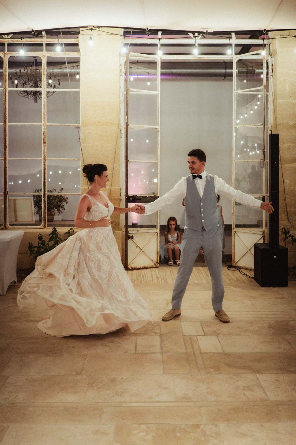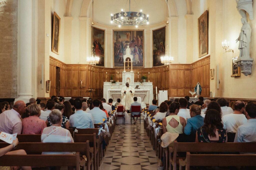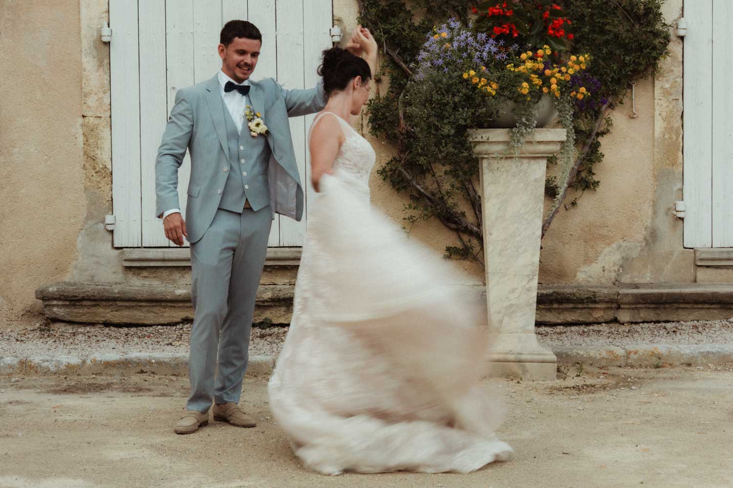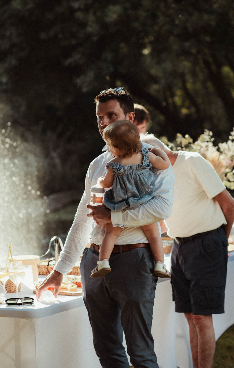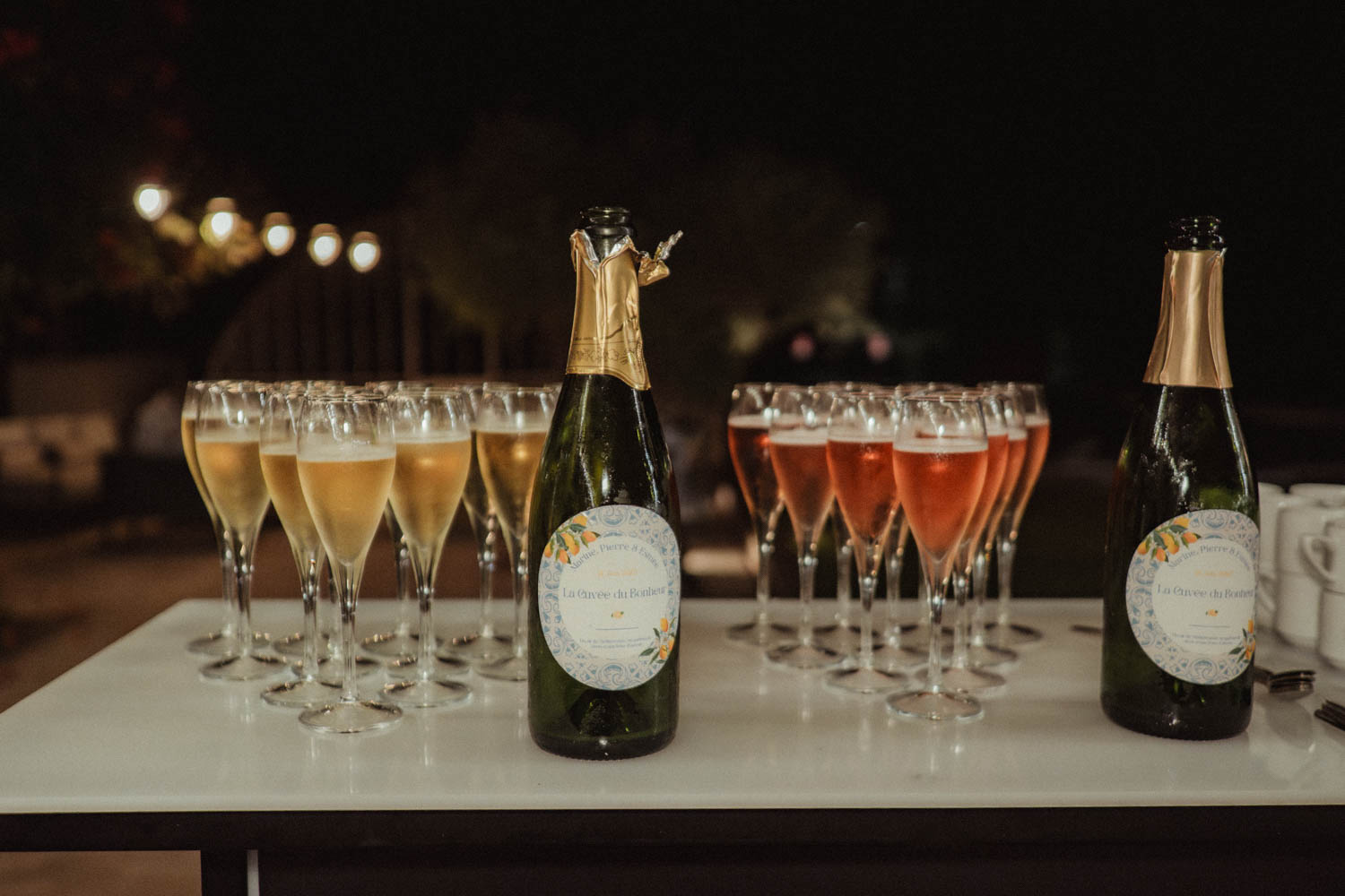 Les cérémonies se sont déroulées quant à elles à la mairie et à l’église de St Georges d’Orques, près de Montpellier. Des glaces et rafraîchissements attendaient les invités près d’un joli pigeonnier et d’un grand tilleul, une fois de retour sur le domaine. Les mariés avaient aussi prévu des bars à spritz et à vinyles pour le cocktail, ainsi que différentes animations : photobooth, bar à tattoos, un medley dansé par les filles, un jeu du bouquet original (sous forme de boîte en verre à décadenasser avec la bonne clé) ainsi qu’une sorte de “qui est qui” à partir d’une collecte de photos de chaque invité(e) enfant (un jeu qui a eu beaucoup de succès, j’ai vu des invités chercher toute la soirée !).