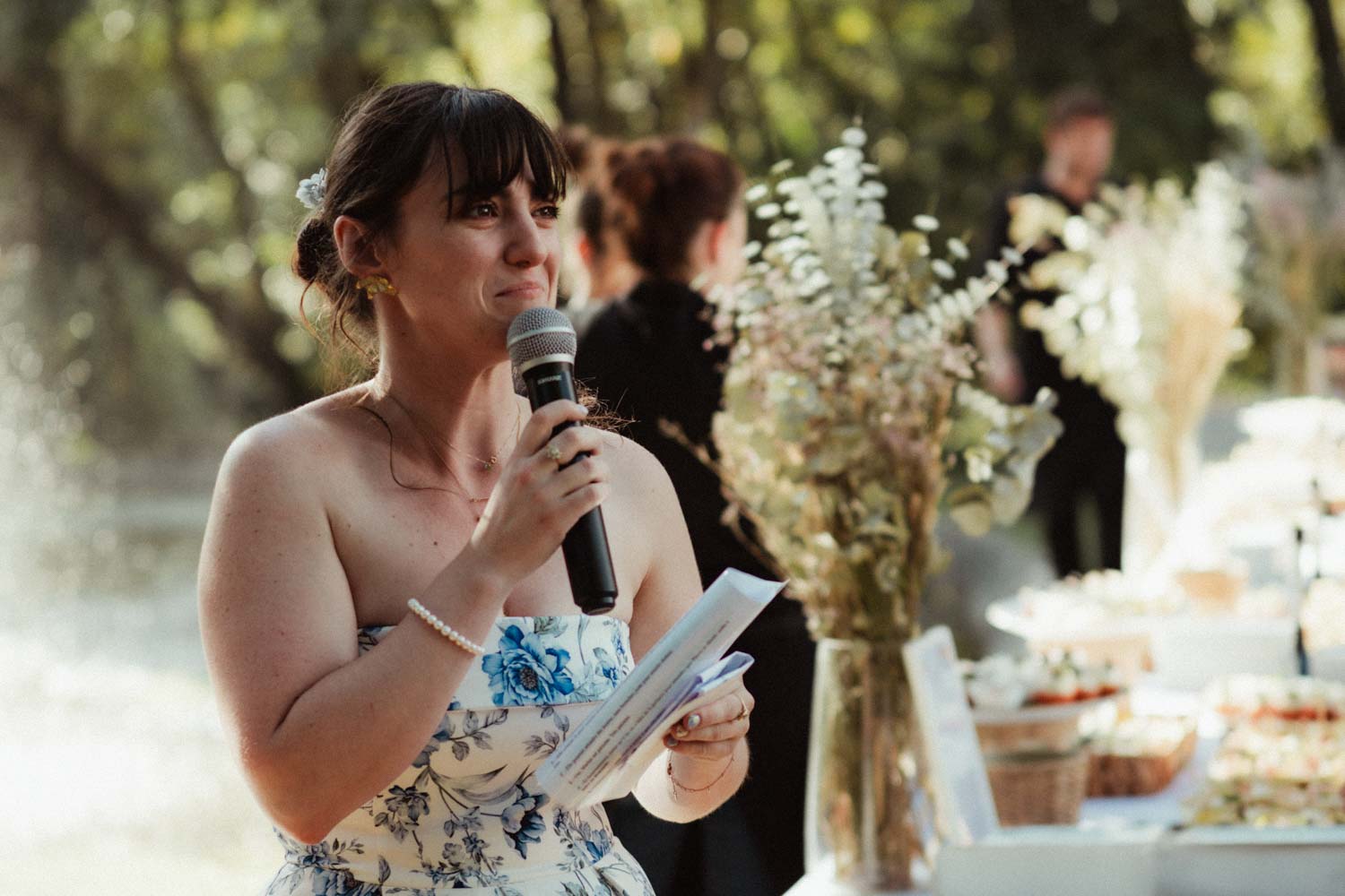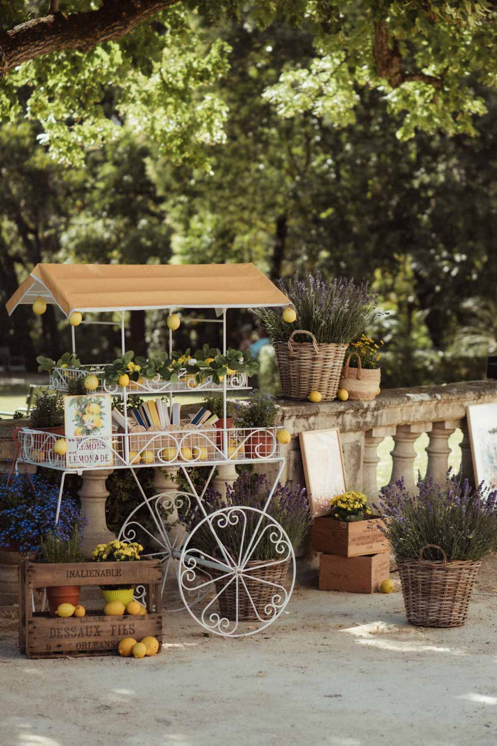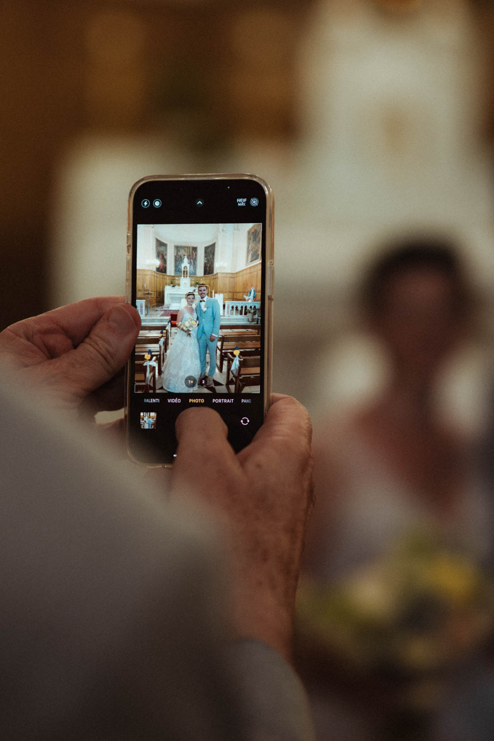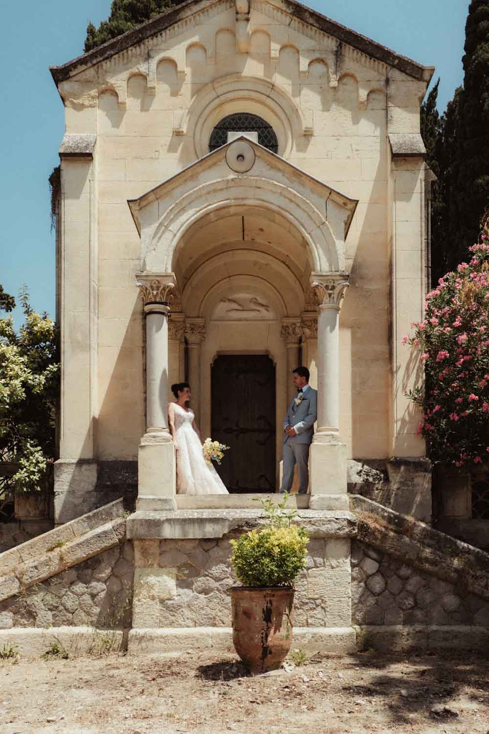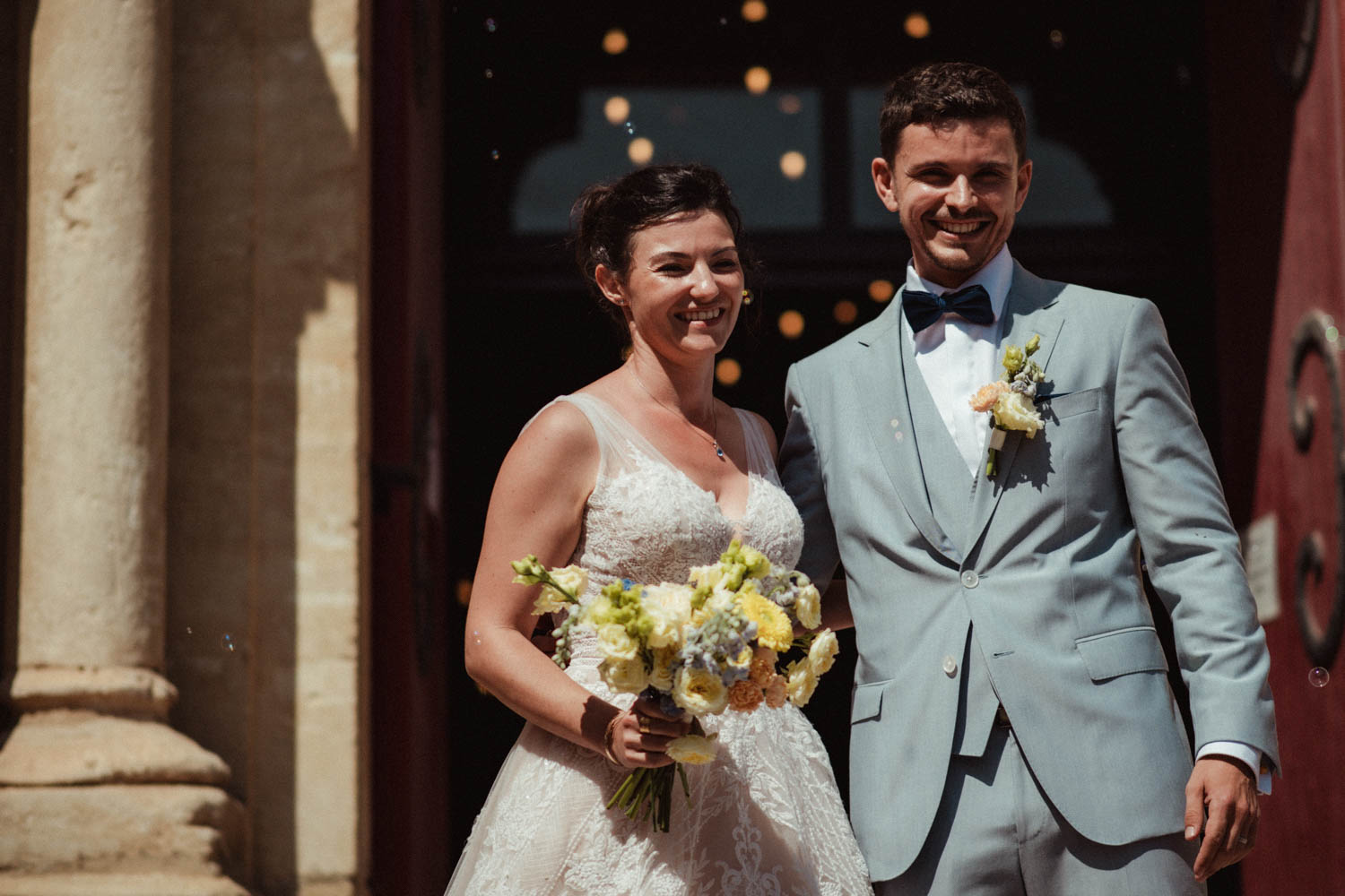 Les cérémonies se sont déroulées quant à elles à la mairie et à l’église de St Georges d’Orques, près de Montpellier. Des glaces et rafraîchissements attendaient les invités près d’un joli pigeonnier et d’un grand tilleul, une fois de retour sur le domaine. Les mariés avaient aussi prévu des bars à spritz et à vinyles pour le cocktail, ainsi que différentes animations : photobooth, bar à tattoos, un medley dansé par les filles, un jeu du bouquet original (sous forme de boîte en verre à décadenasser avec la bonne clé) ainsi qu’une sorte de “qui est qui” à partir d’une collecte de photos de chaque invité(e) enfant (un jeu qui a eu beaucoup de succès, j’ai vu des invités chercher toute la soirée !).