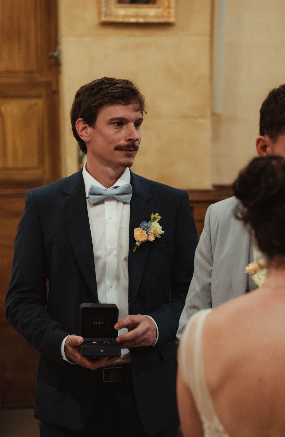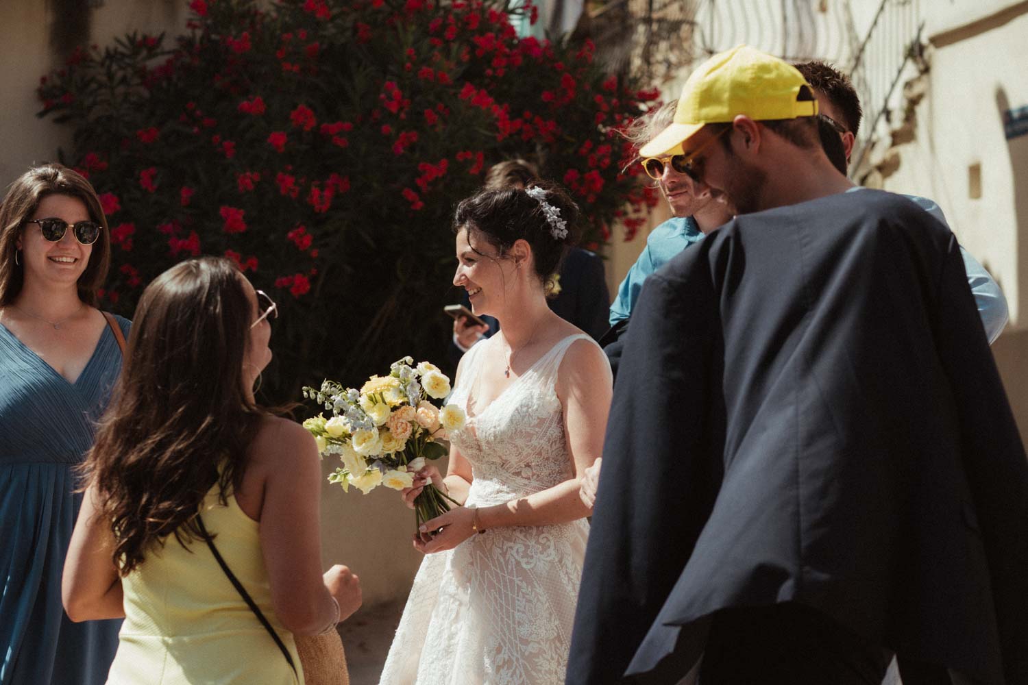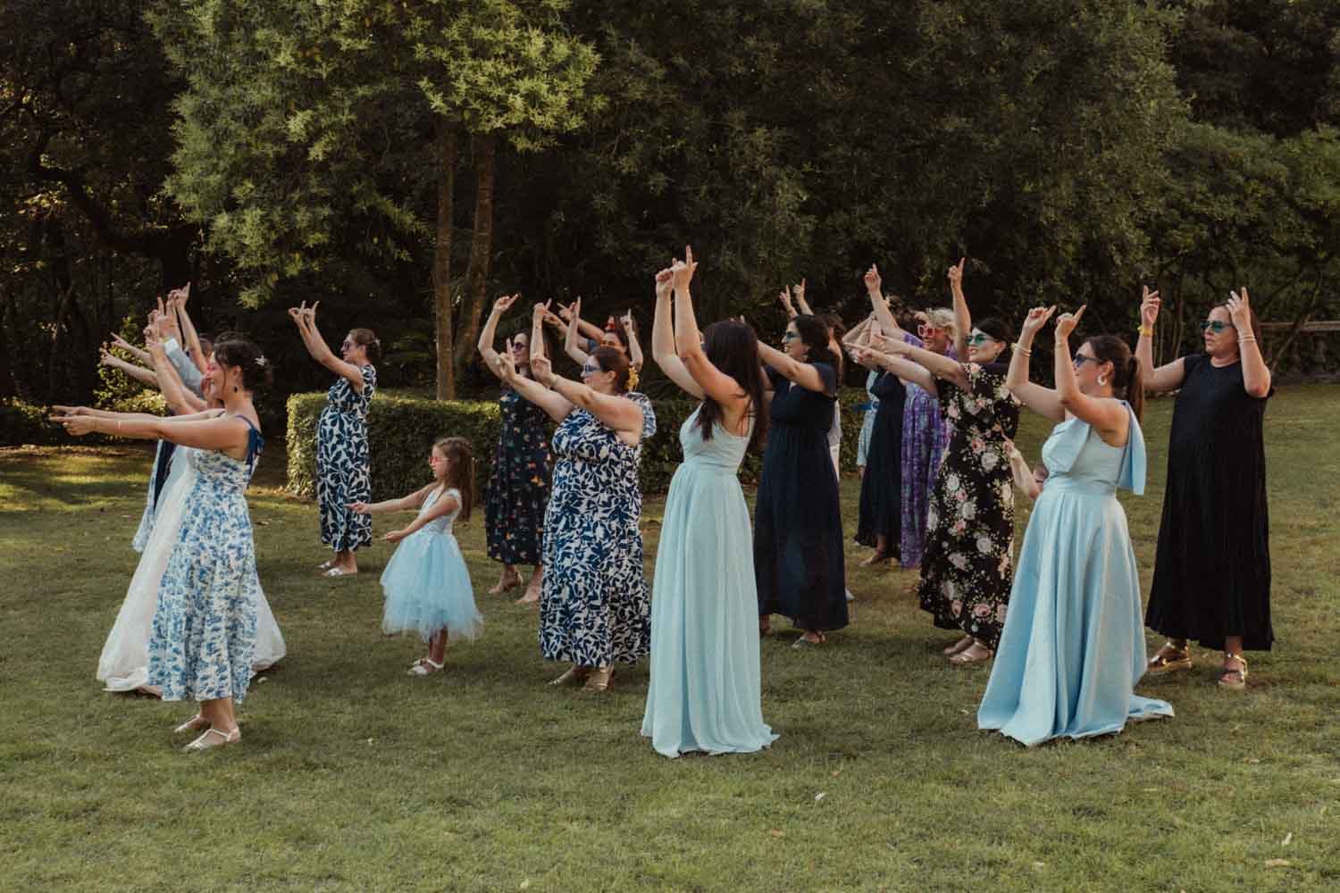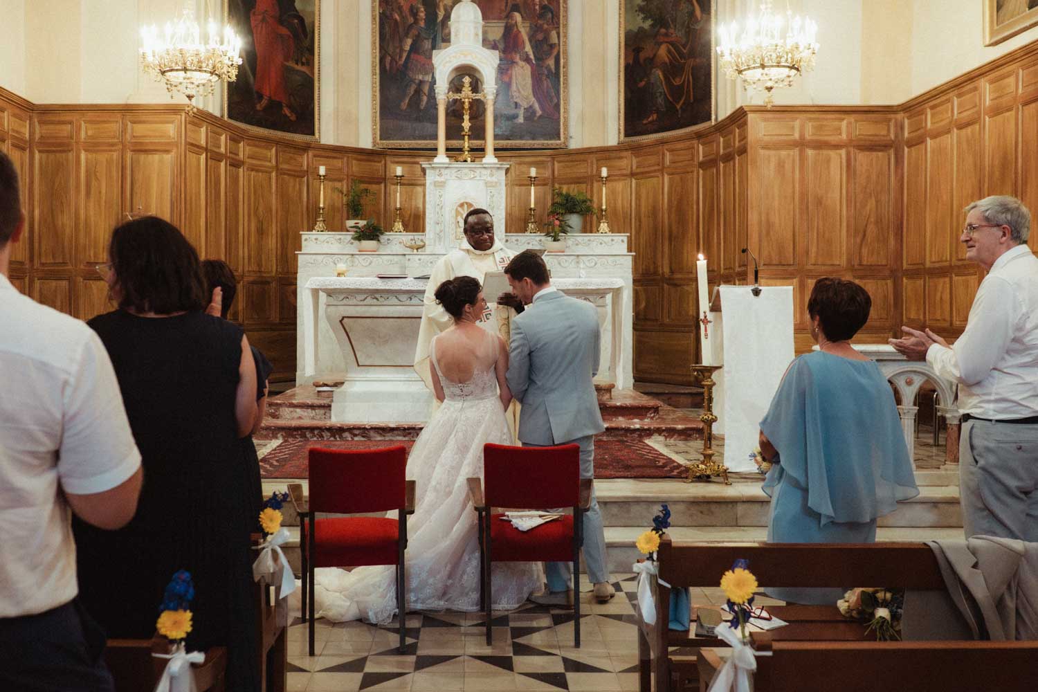 Les cérémonies se sont déroulées quant à elles à la mairie et à l’église de St Georges d’Orques, près de Montpellier. Des glaces et rafraîchissements attendaient les invités près d’un joli pigeonnier et d’un grand tilleul, une fois de retour sur le domaine. Les mariés avaient aussi prévu des bars à spritz et à vinyles pour le cocktail, ainsi que différentes animations : photobooth, bar à tattoos, un medley dansé par les filles, un jeu du bouquet original (sous forme de boîte en verre à décadenasser avec la bonne clé) ainsi qu’une sorte de “qui est qui” à partir d’une collecte de photos de chaque invité(e) enfant (un jeu qui a eu beaucoup de succès, j’ai vu des invités chercher toute la soirée !).