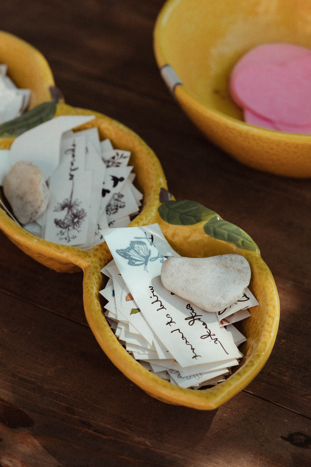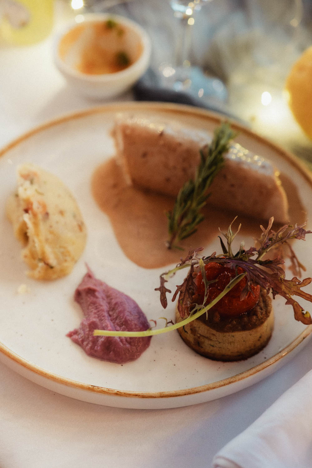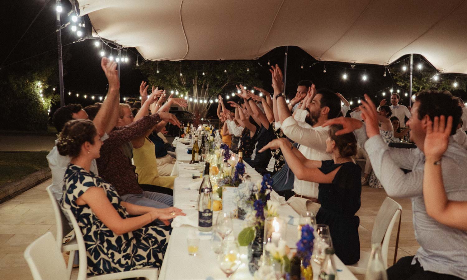 Le dîner a été lancer avec un shooter de limoncello et ponctué de plusieurs jeux pensés par les témoins et incluant de manière particulièrement ludique à la fois invités et mariés : faire lever certain(e)s invité(e)s à partir d’une liste distribuée peu avant pour faire deviner aux mariés le point commun entre elleux (par exemple, iels ont toustes les yeux bleus), ou encore organiser une sorte de loto de rencontres autour de thématiques annuelles : “le(la) gagnant(e) devra offrir des chocolats de Pâques aux mariés” (je ne sais plus si cette idée a réellement existé, mais c’était dans cet esprit et ça a beaucoup plu aussi !).