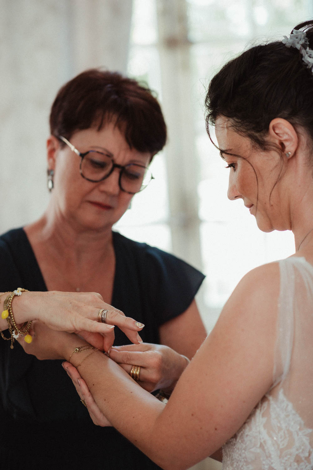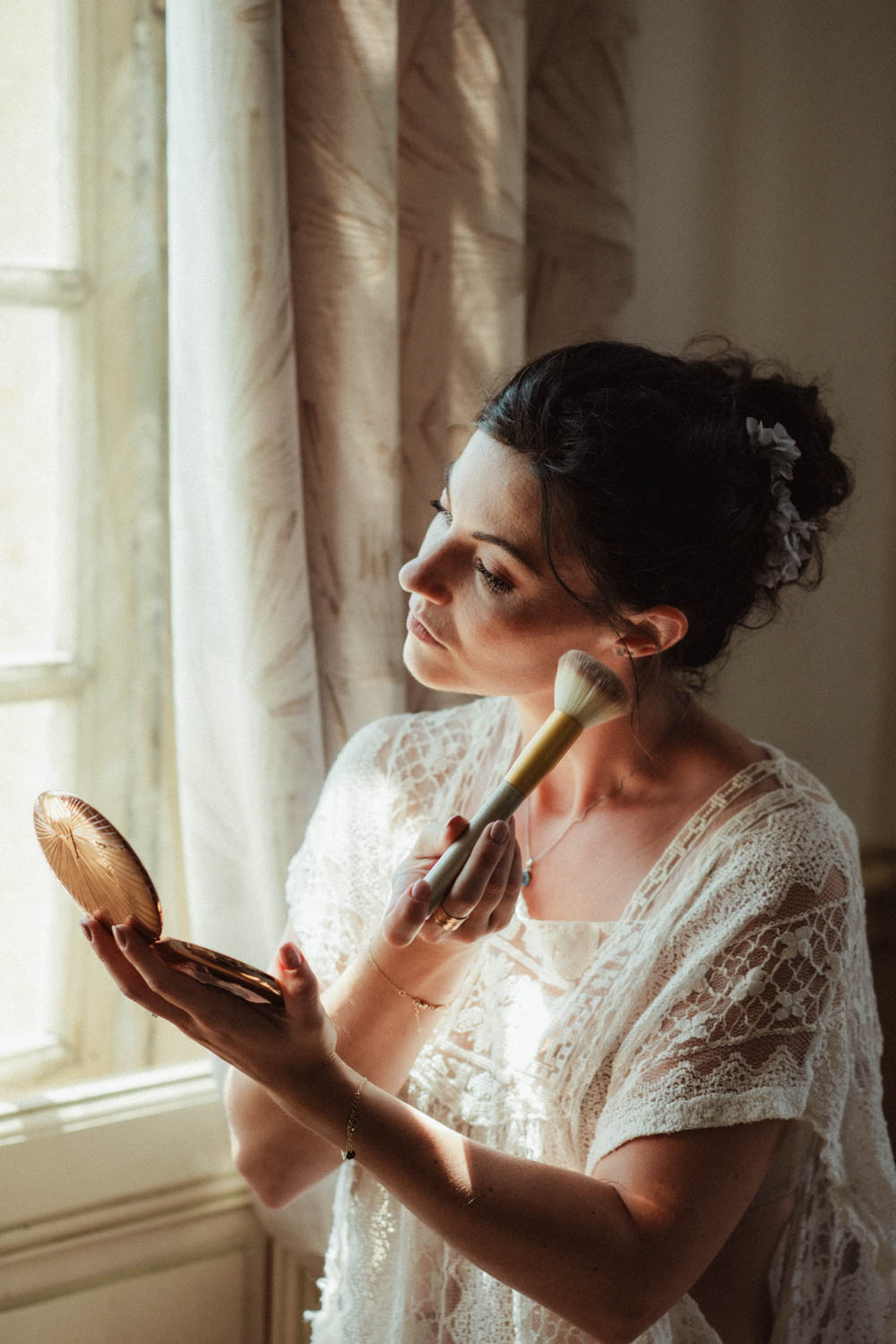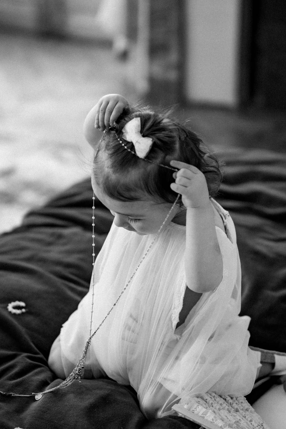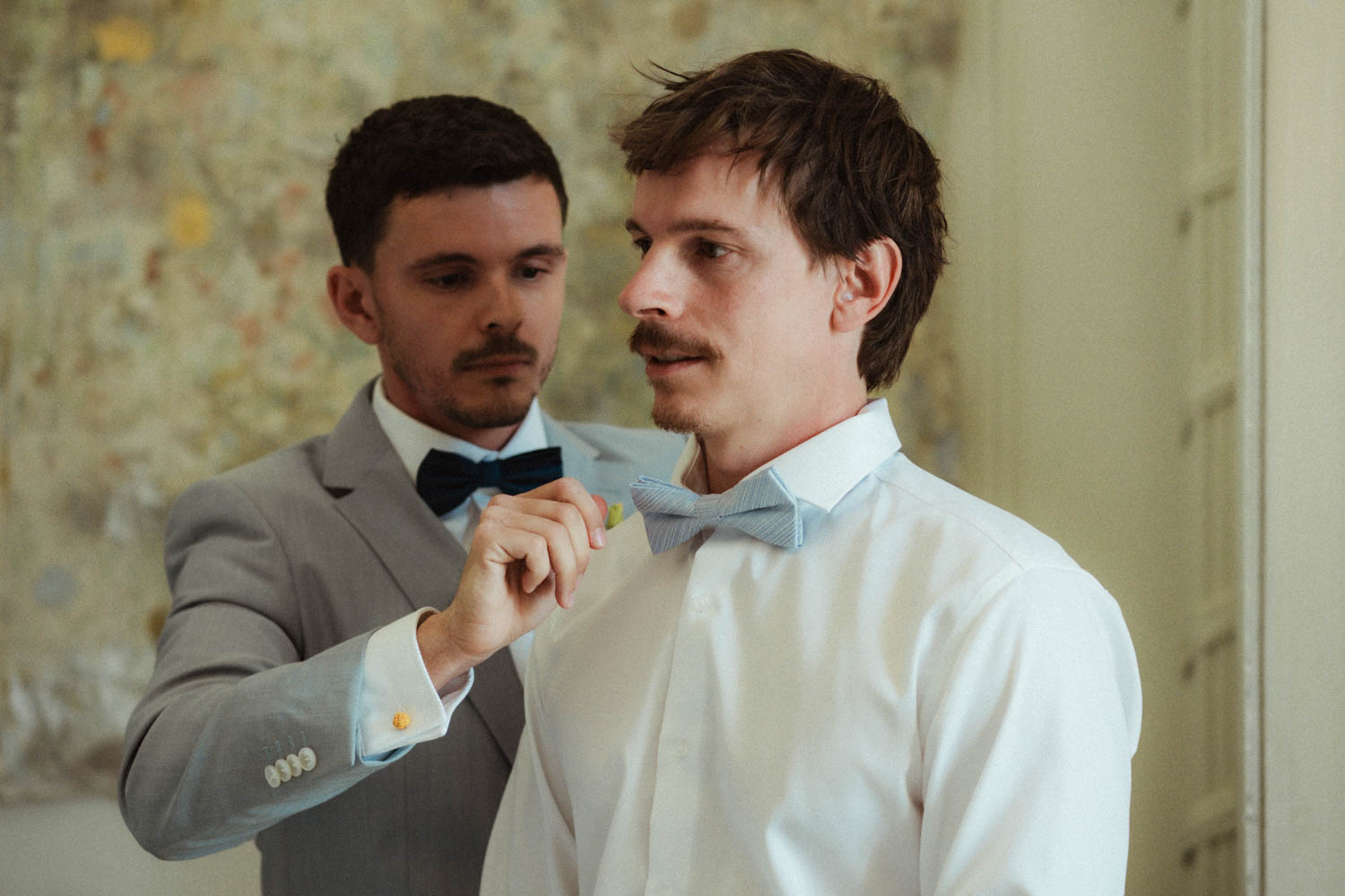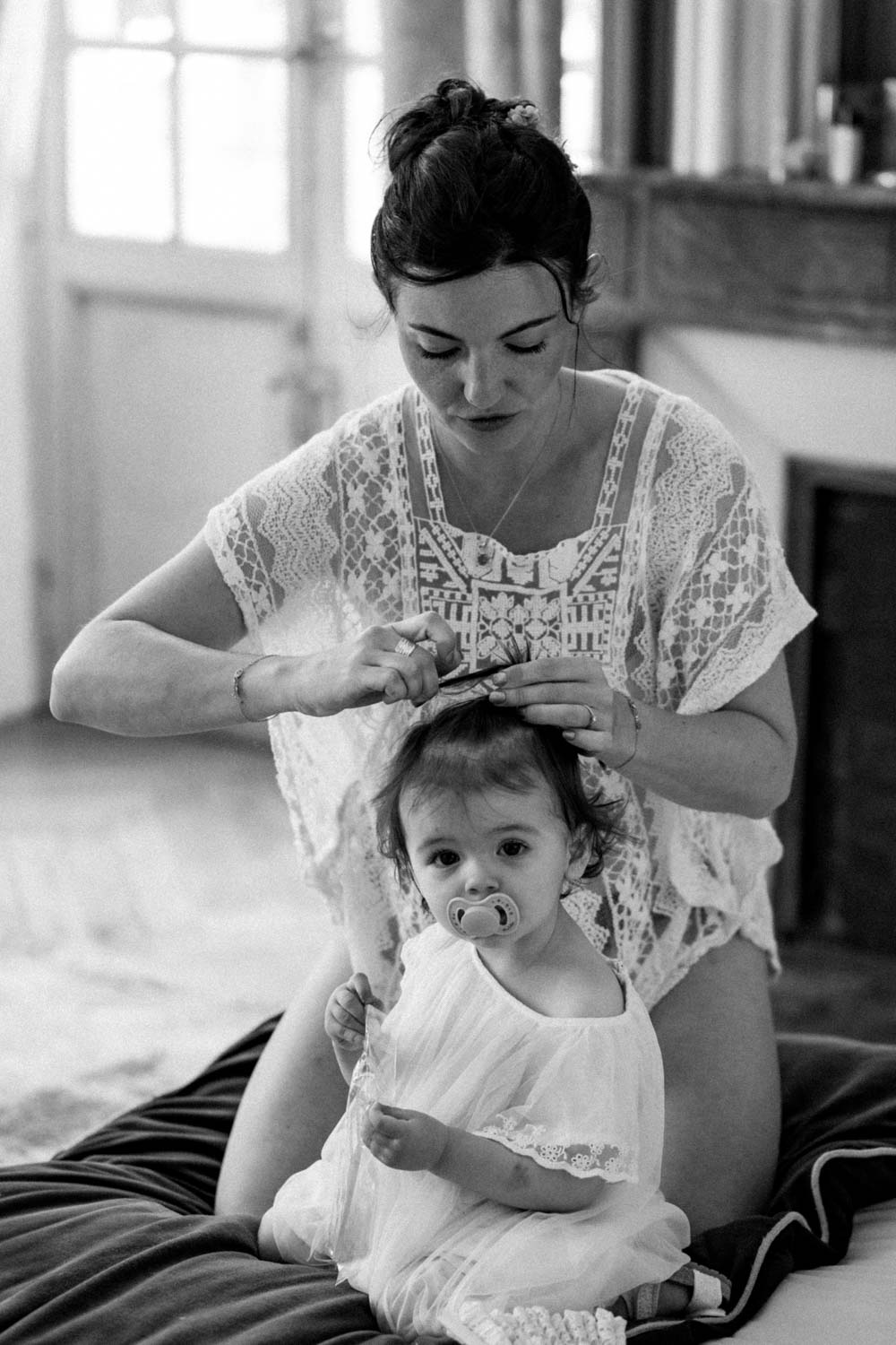 M. et P. se sont préparés le matin au Domaine de Rieucoulon à Montpellier, dont les chambres superbes m’ont offert la lumière parfaite pour capturer les tenues, petits détails et les habillages de chacun (dont la toute petite fille du couple !). Le first look a eu lieu dans le magnifique escalier en bois qui dessert les différentes chambres.