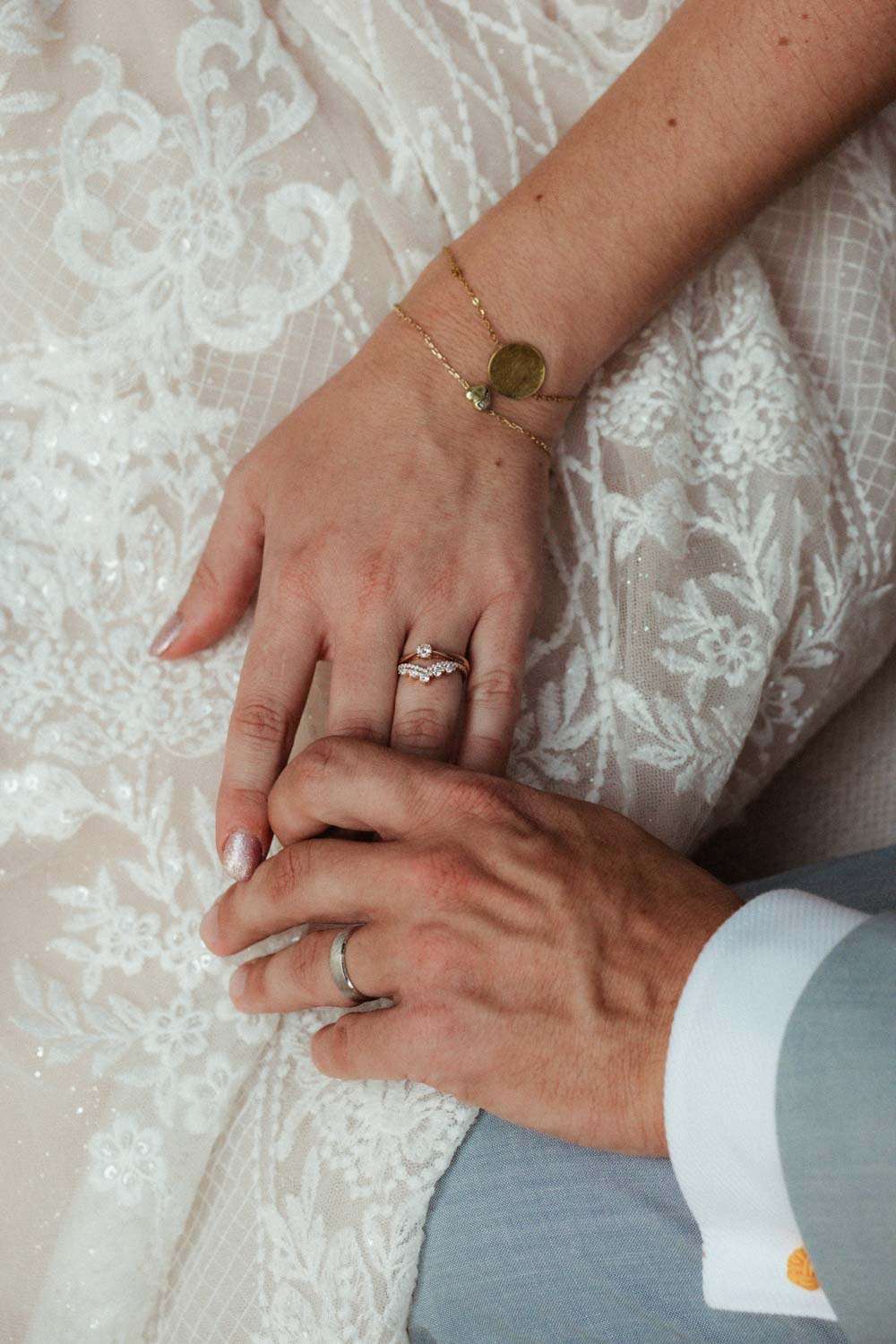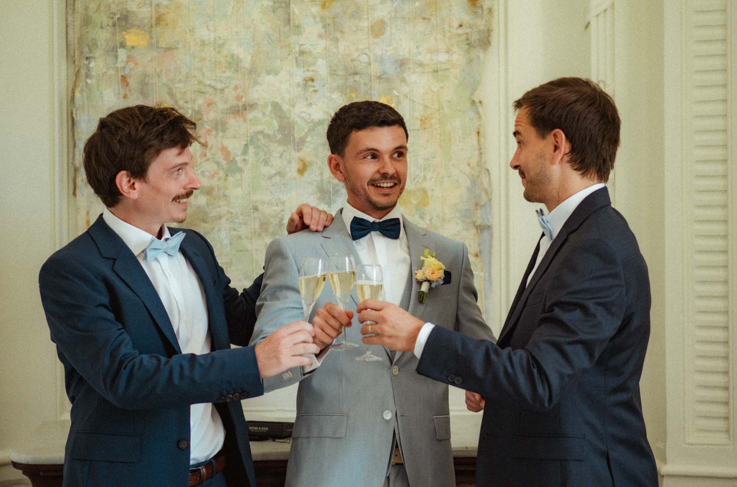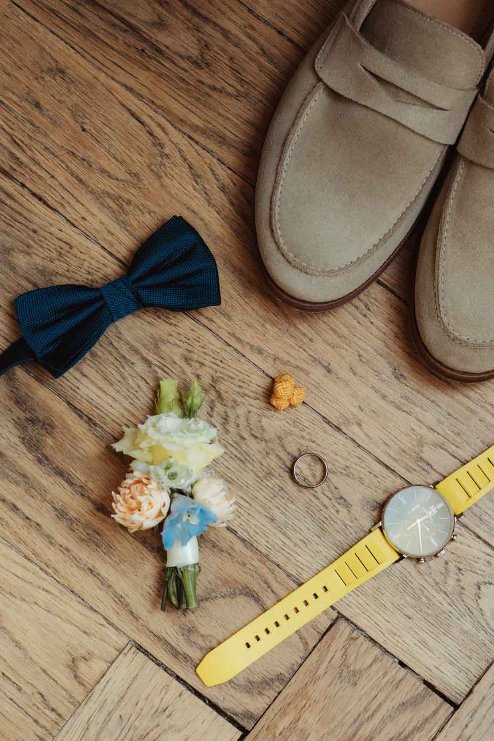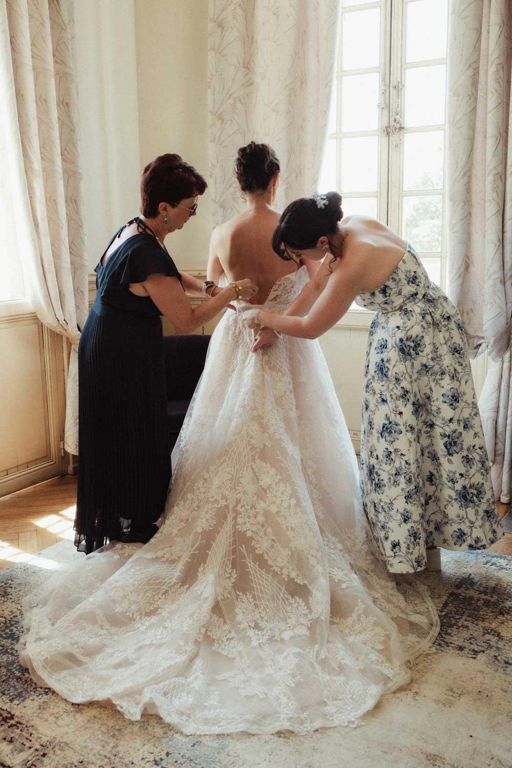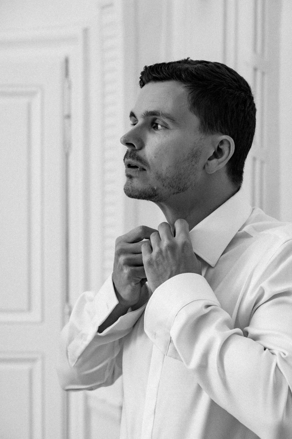 M. et P. se sont préparés le matin au Domaine de Rieucoulon à Montpellier, dont les chambres superbes m’ont offert la lumière parfaite pour capturer les tenues, petits détails et les habillages de chacun (dont la toute petite fille du couple !). Le first look a eu lieu dans le magnifique escalier en bois qui dessert les différentes chambres.