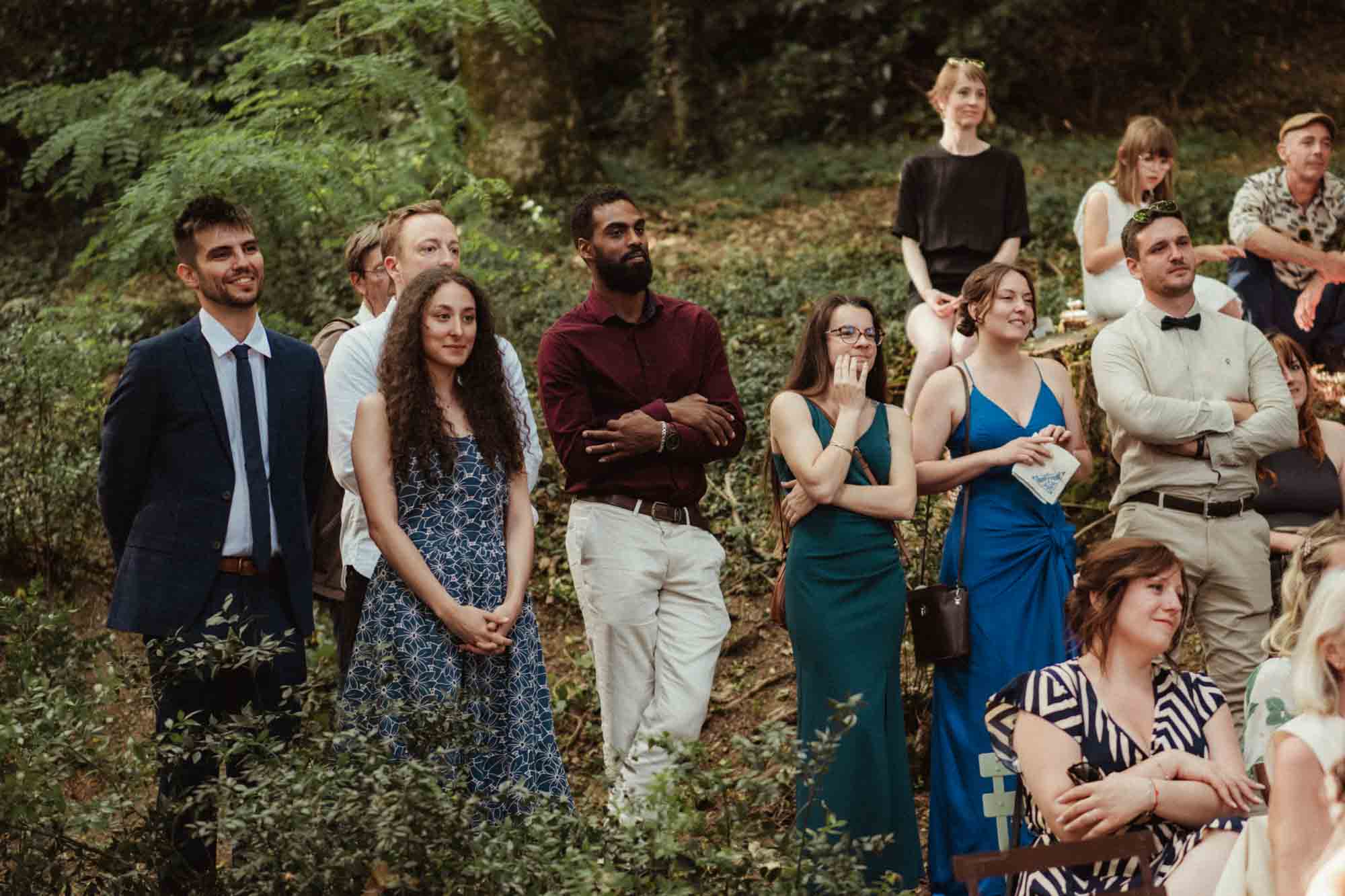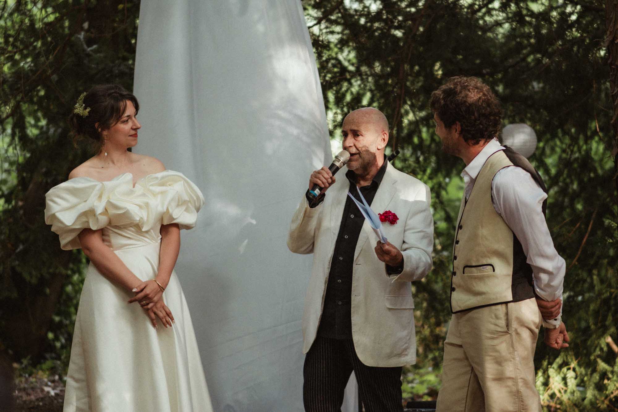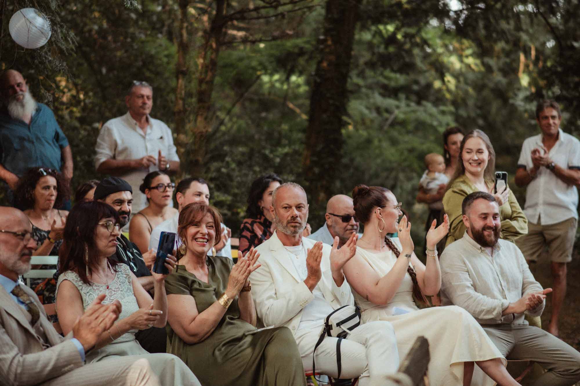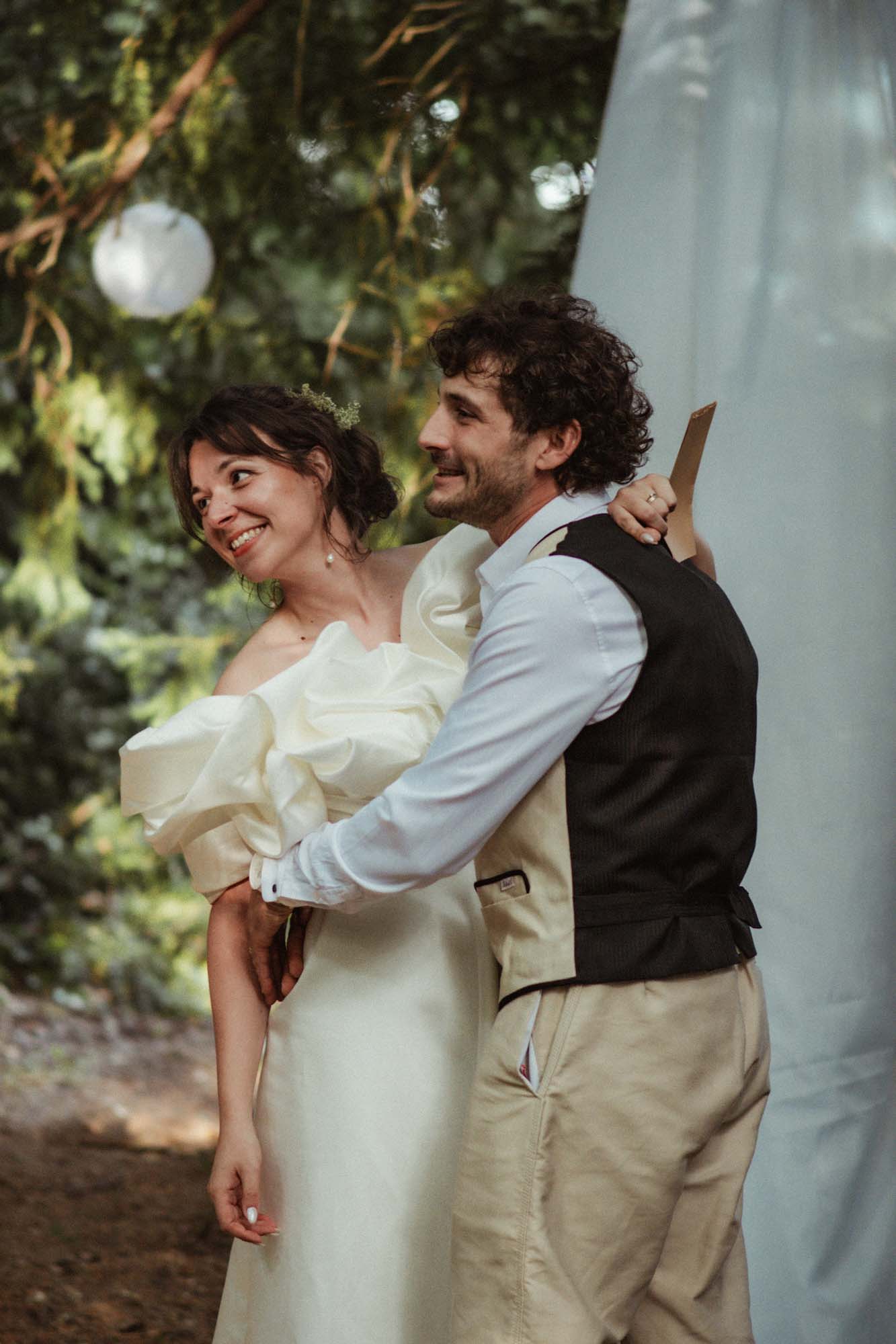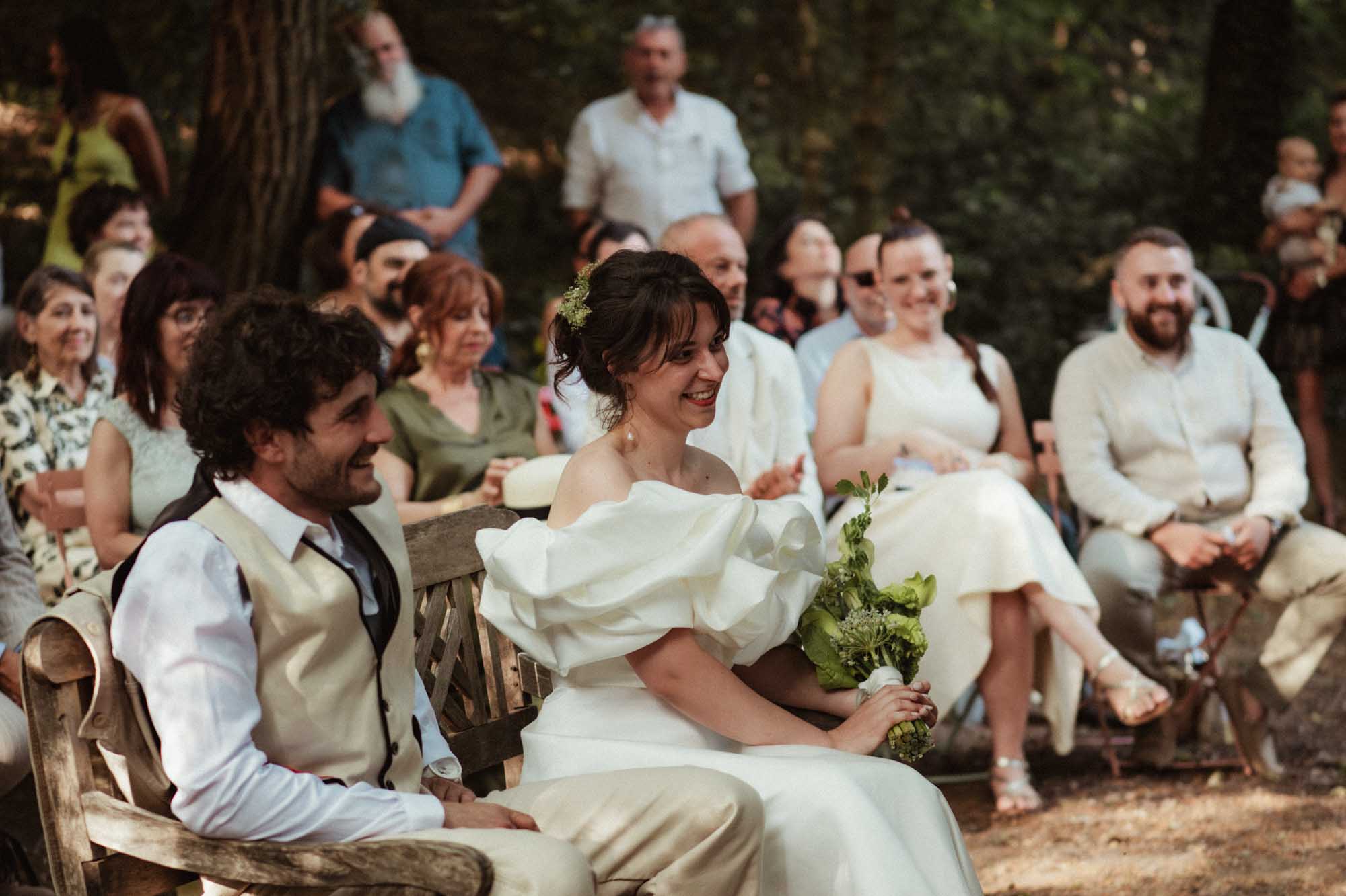 La cérémonie laïque, présidée par l’un des oncles du marié, s’est déroulée dans le petit bois du domaine, le format intimiste du mariage collant à merveille avec l’endroit. Deux enfants ont apporté les alliances (mais j’ai fait le choix, comme habituellement, de ne pas montrer ces photos dans ma sélection ci-dessous afin de préserver leur anonymat).
