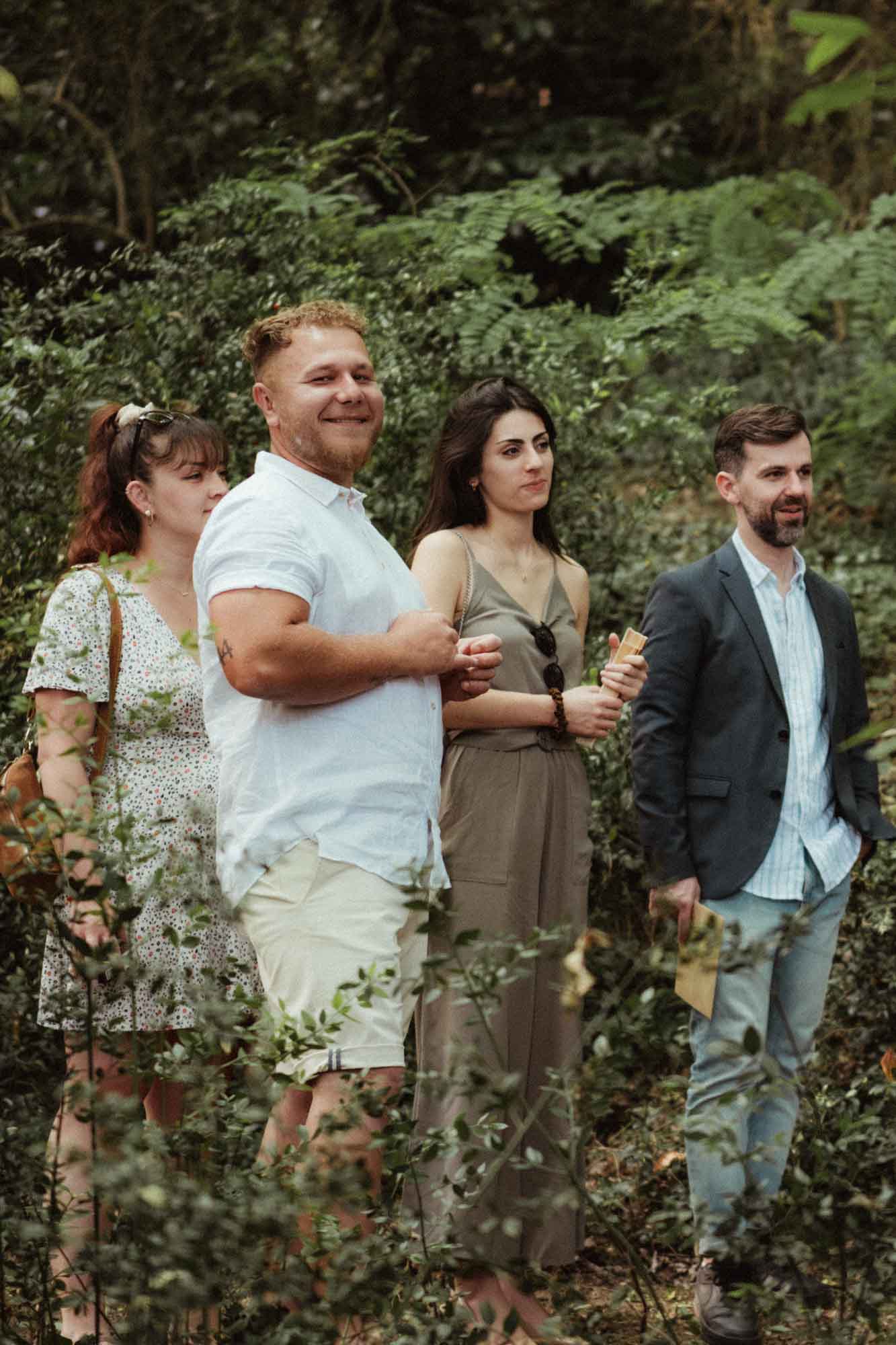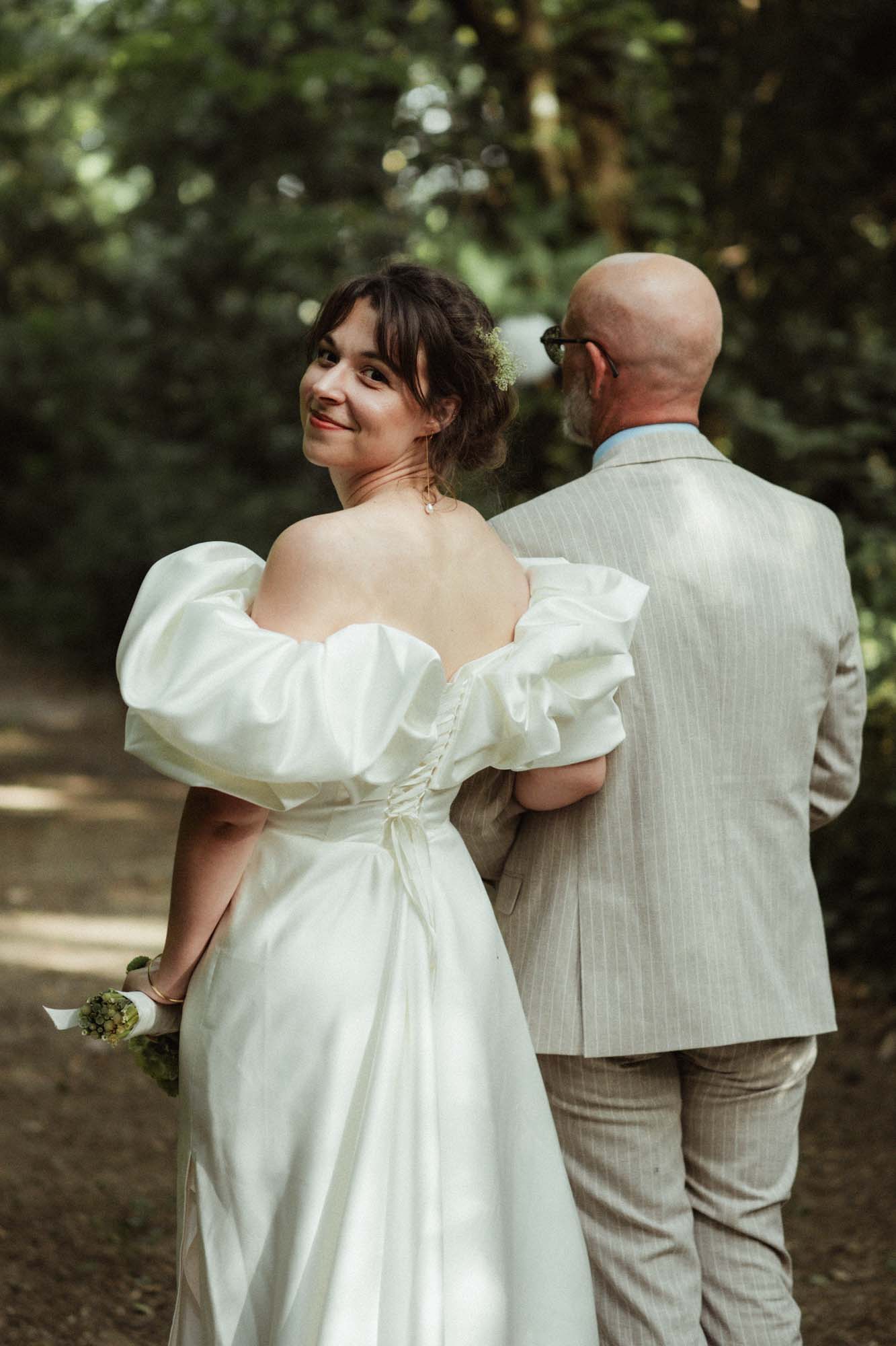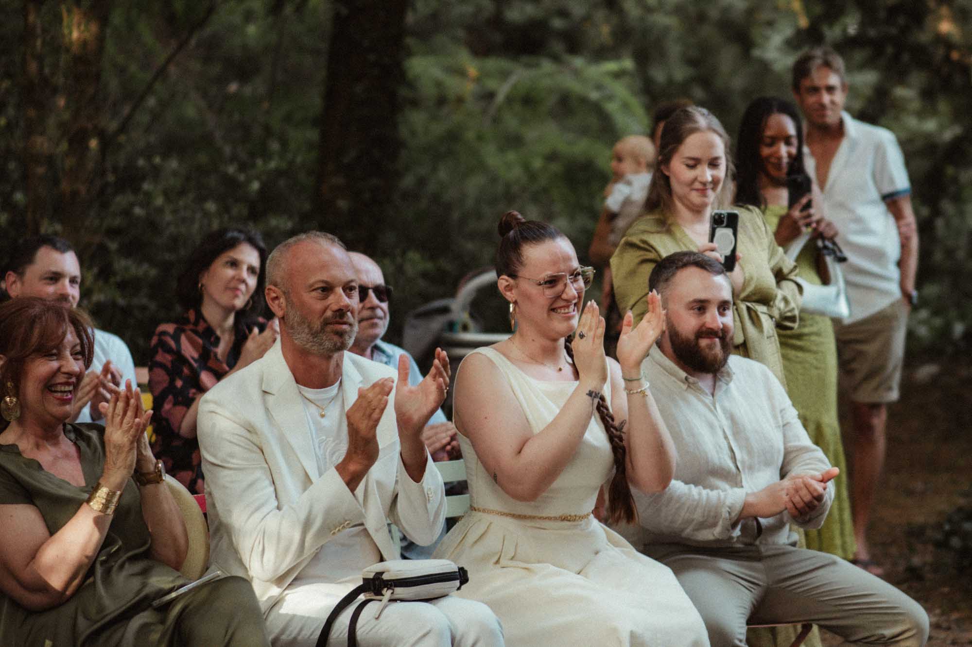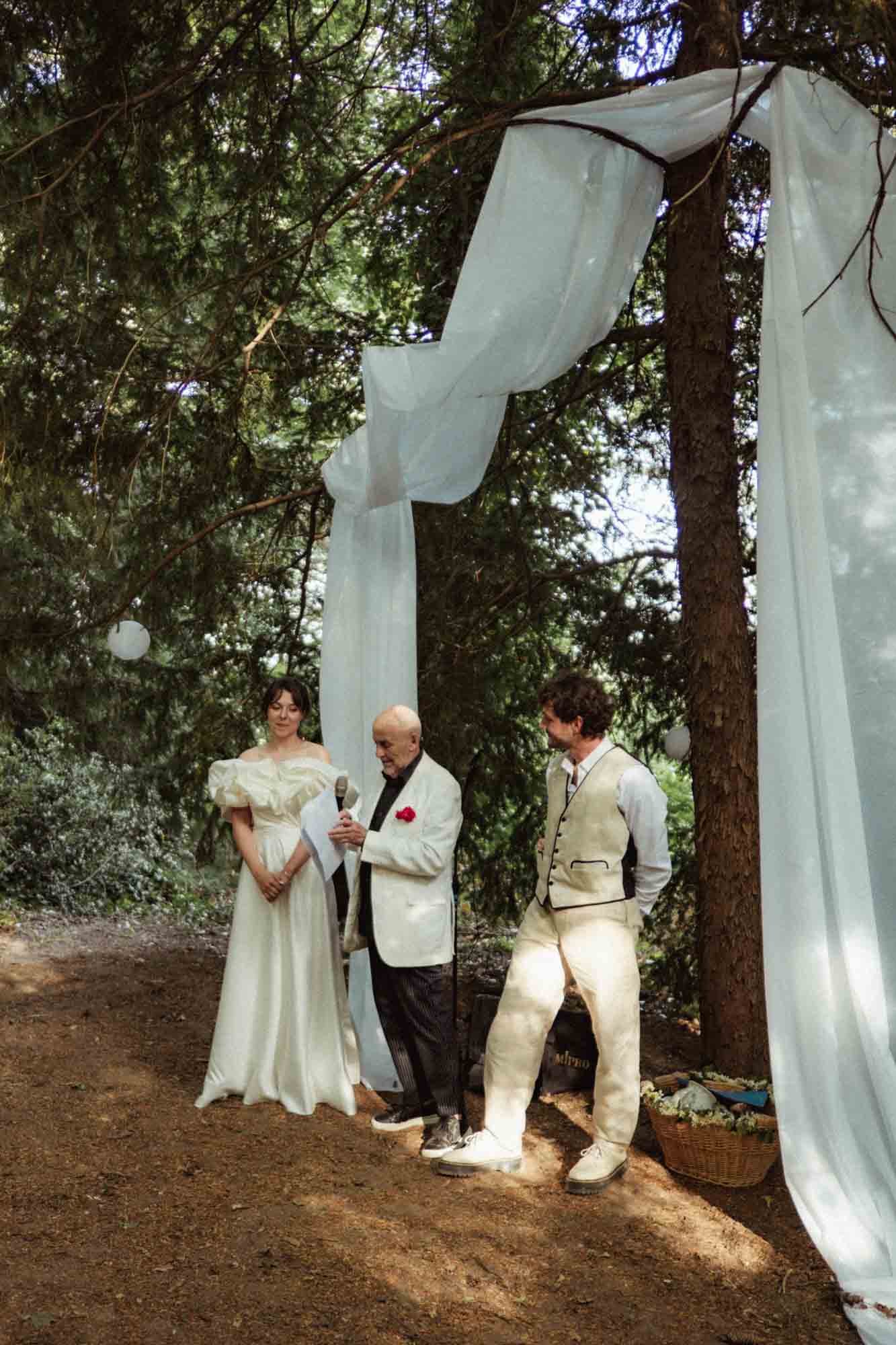 La cérémonie laïque, présidée par l’un des oncles du marié, s’est déroulée dans le petit bois du domaine, le format intimiste du mariage collant à merveille avec l’endroit. Deux enfants ont apporté les alliances (mais j’ai fait le choix, comme habituellement, de ne pas montrer ces photos dans ma sélection ci-dessous afin de préserver leur anonymat).