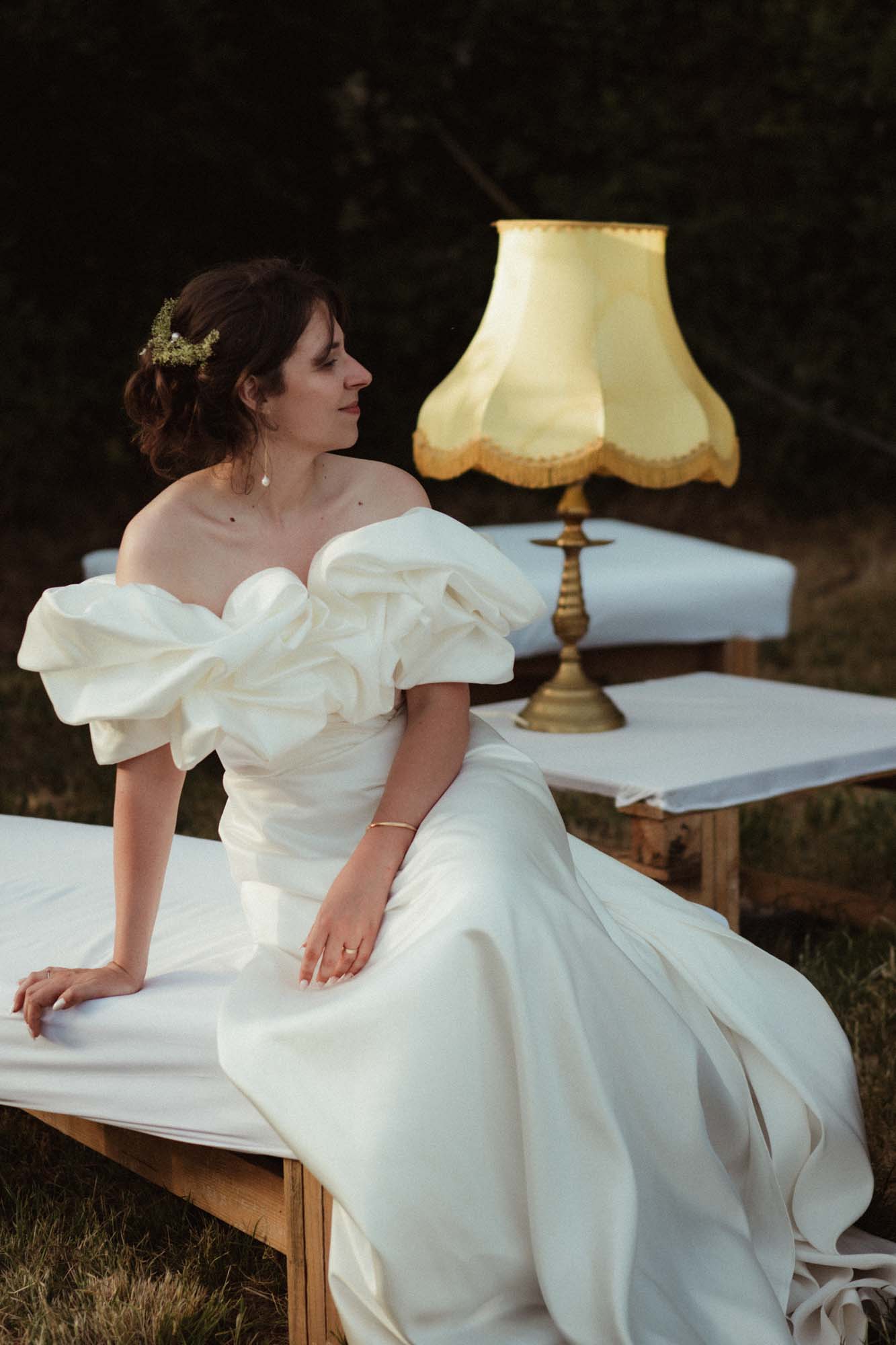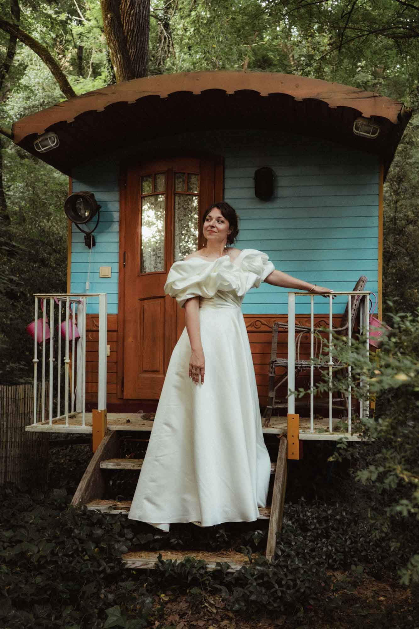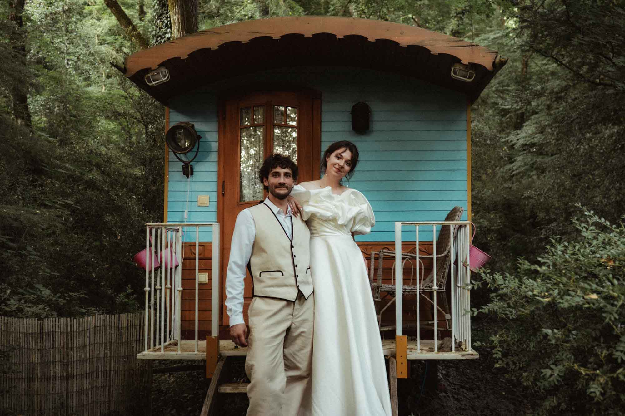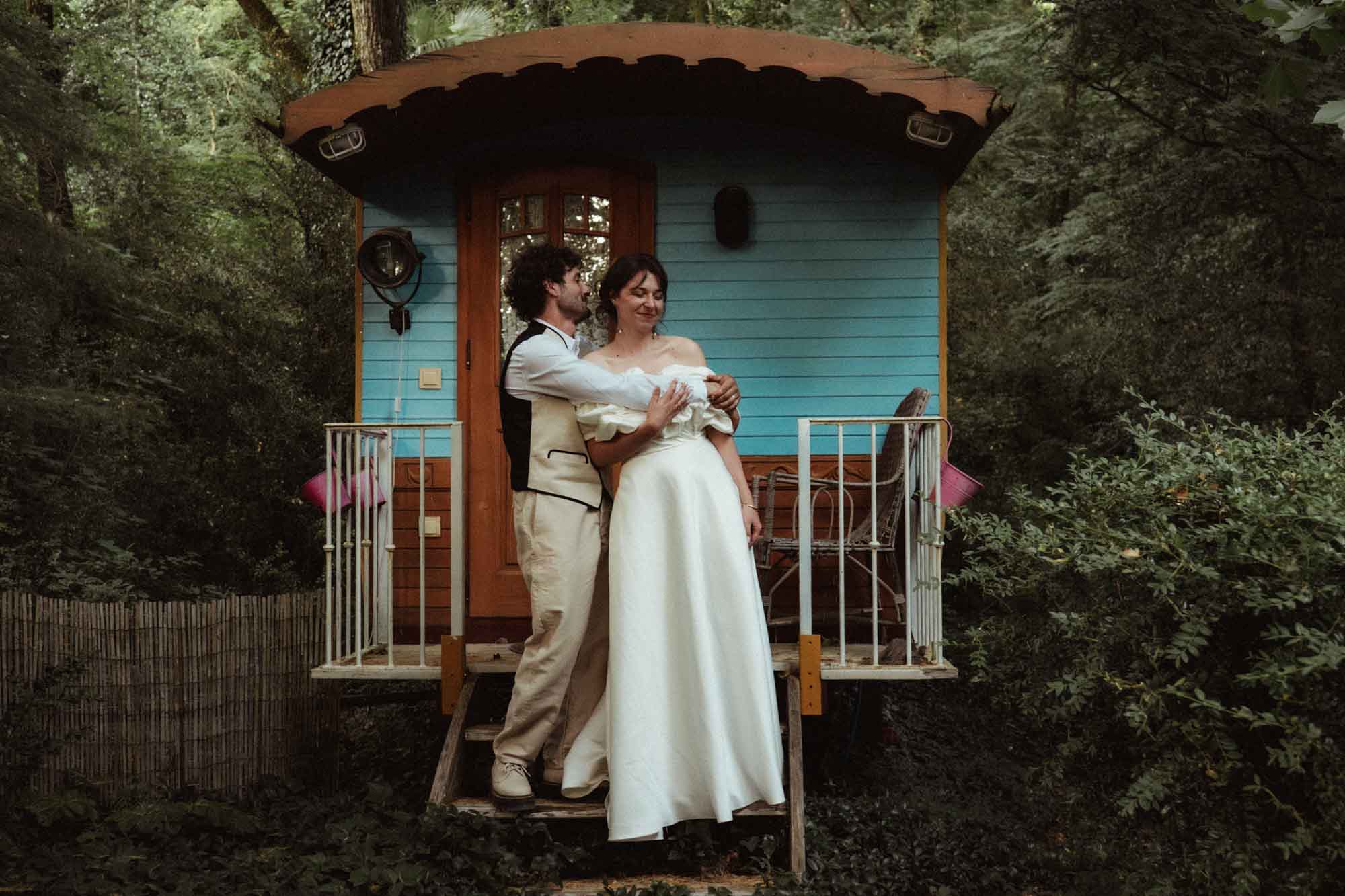 Après la cérémonie, j’ai réalisé des photos de groupes et de cocktail puis de l’échange des vœux des mariés, réalisé à l’écart en toute intimité. Pour les photos de couple, j’ai mis à profit la devanture d’une jolie roulotte aménagée qui sert à l’un des membres de la famille lorsqu’il se rend sur place. Vibe boho garantie (j’adore évidemment) ! On a aussi profité du jardin et de la vue magnifique qu’il offre. Le traiteur ayant apporté un plateau pour les mariés pile à ce moment-là, j’ai décidé de l’intégrer pleinement à la séance en les faisant s’asseoir sur un petit muret pour le savourer. C’est une idée que je me félicite d’ailleurs d’avoir eue car j’ai réalisé certaines photos parmi mes préférées de mon portfolio mariage (on m’a même dit sur Instagram qu’il y avait un petit effet “tableau de la Renaissance”, la fierté absolue). Un peu plus tard, j’ai aussi profité de leur installation de guirlandes lumineuses dans un grand arbre du jardin pour les placer au milieu : une ambiance différente mais qui me plaît beaucoup aussi ! J’ai été d’ailleurs très heureuse que certaines de mes photos préférées de ce reportage se soient retrouvées dans la sélection de tirages réalisée par les mariés.