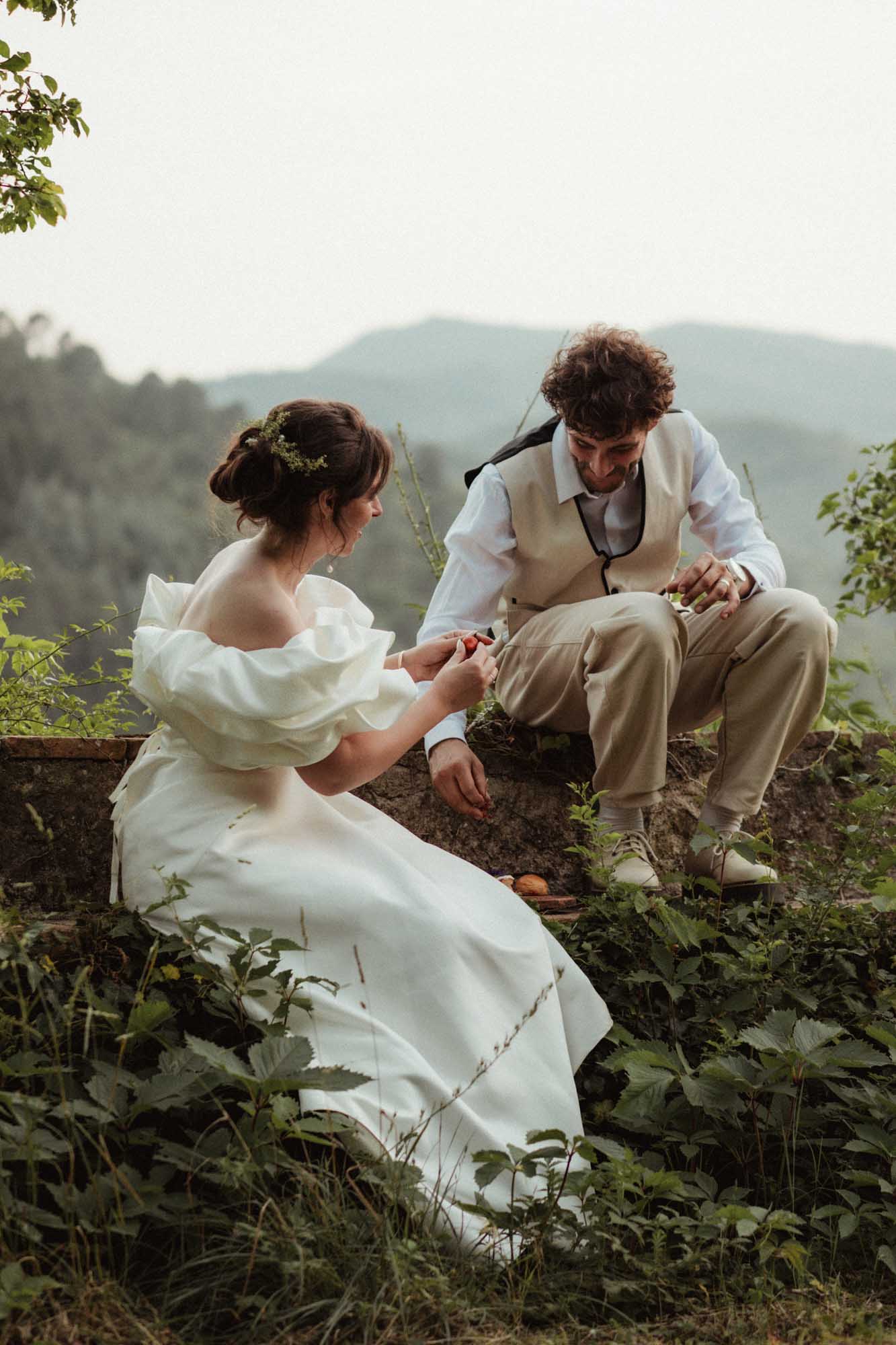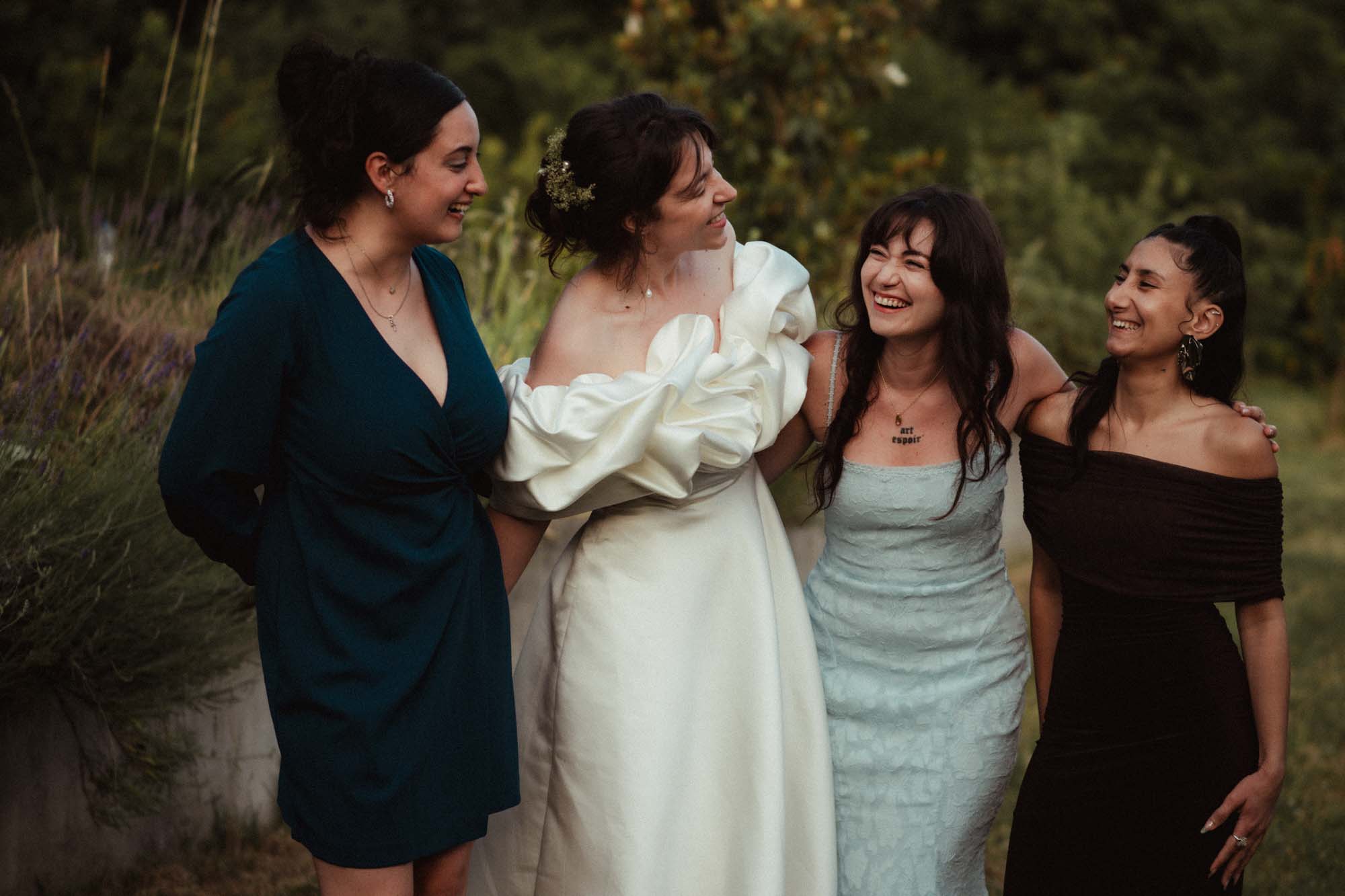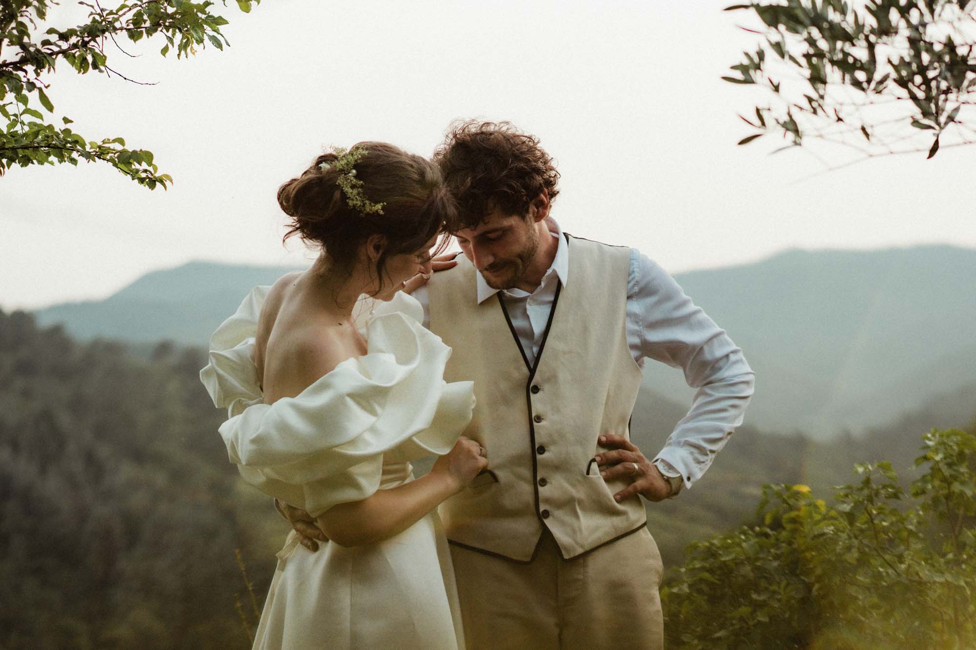 Après la cérémonie, j’ai réalisé des photos de groupes et de cocktail puis de l’échange des vœux des mariés, réalisé à l’écart en toute intimité. Pour les photos de couple, j’ai mis à profit la devanture d’une jolie roulotte aménagée qui sert à l’un des membres de la famille lorsqu’il se rend sur place. Vibe boho garantie (j’adore évidemment) ! On a aussi profité du jardin et de la vue magnifique qu’il offre. Le traiteur ayant apporté un plateau pour les mariés pile à ce moment-là, j’ai décidé de l’intégrer pleinement à la séance en les faisant s’asseoir sur un petit muret pour le savourer. C’est une idée que je me félicite d’ailleurs d’avoir eue car j’ai réalisé certaines photos parmi mes préférées de mon portfolio mariage (on m’a même dit sur Instagram qu’il y avait un petit effet “tableau de la Renaissance”, la fierté absolue). Un peu plus tard, j’ai aussi profité de leur installation de guirlandes lumineuses dans un grand arbre du jardin pour les placer au milieu : une ambiance différente mais qui me plaît beaucoup aussi ! J’ai été d’ailleurs très heureuse que certaines de mes photos préférées de ce reportage se soient retrouvées dans la sélection de tirages réalisée par les mariés.