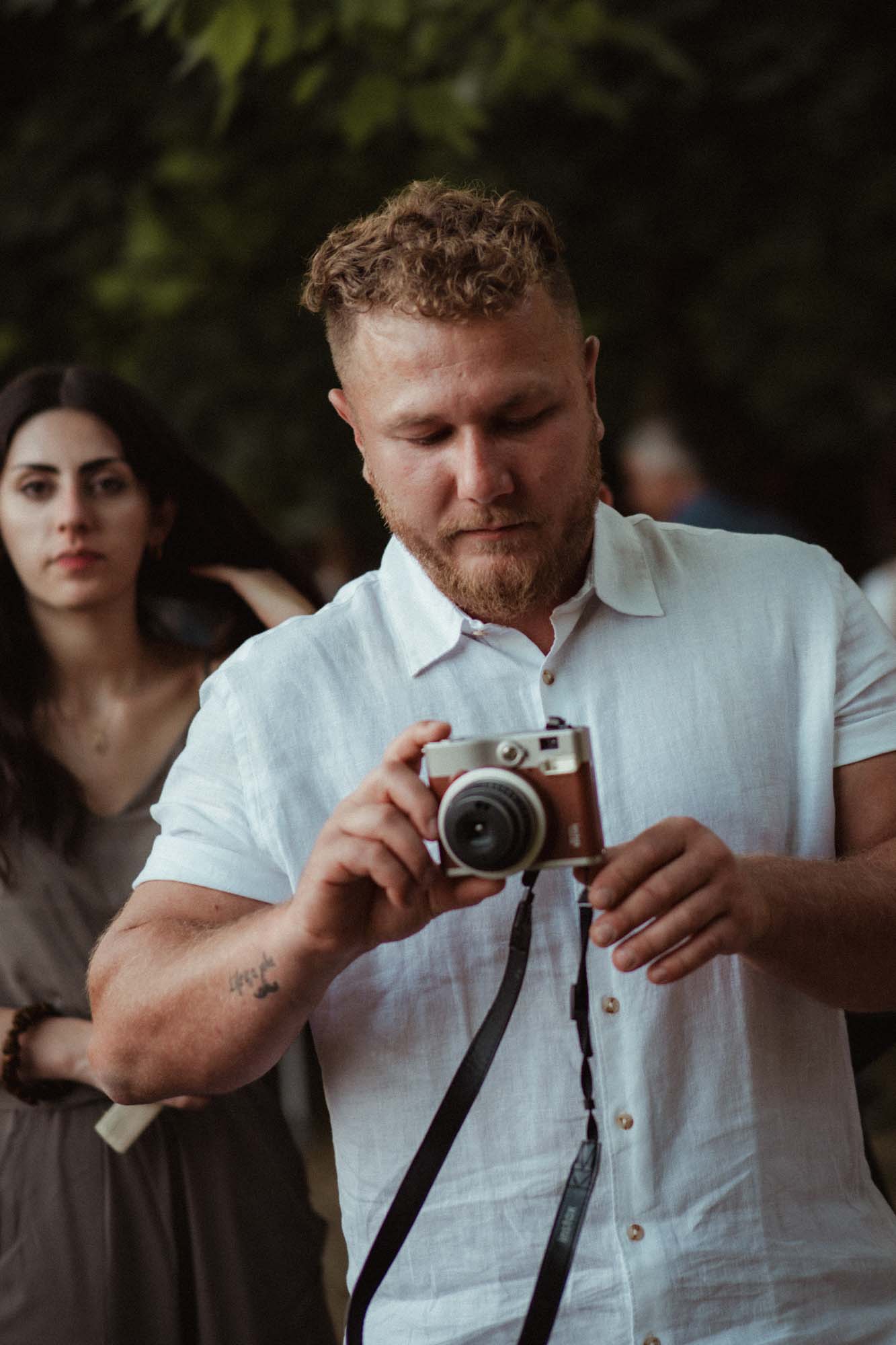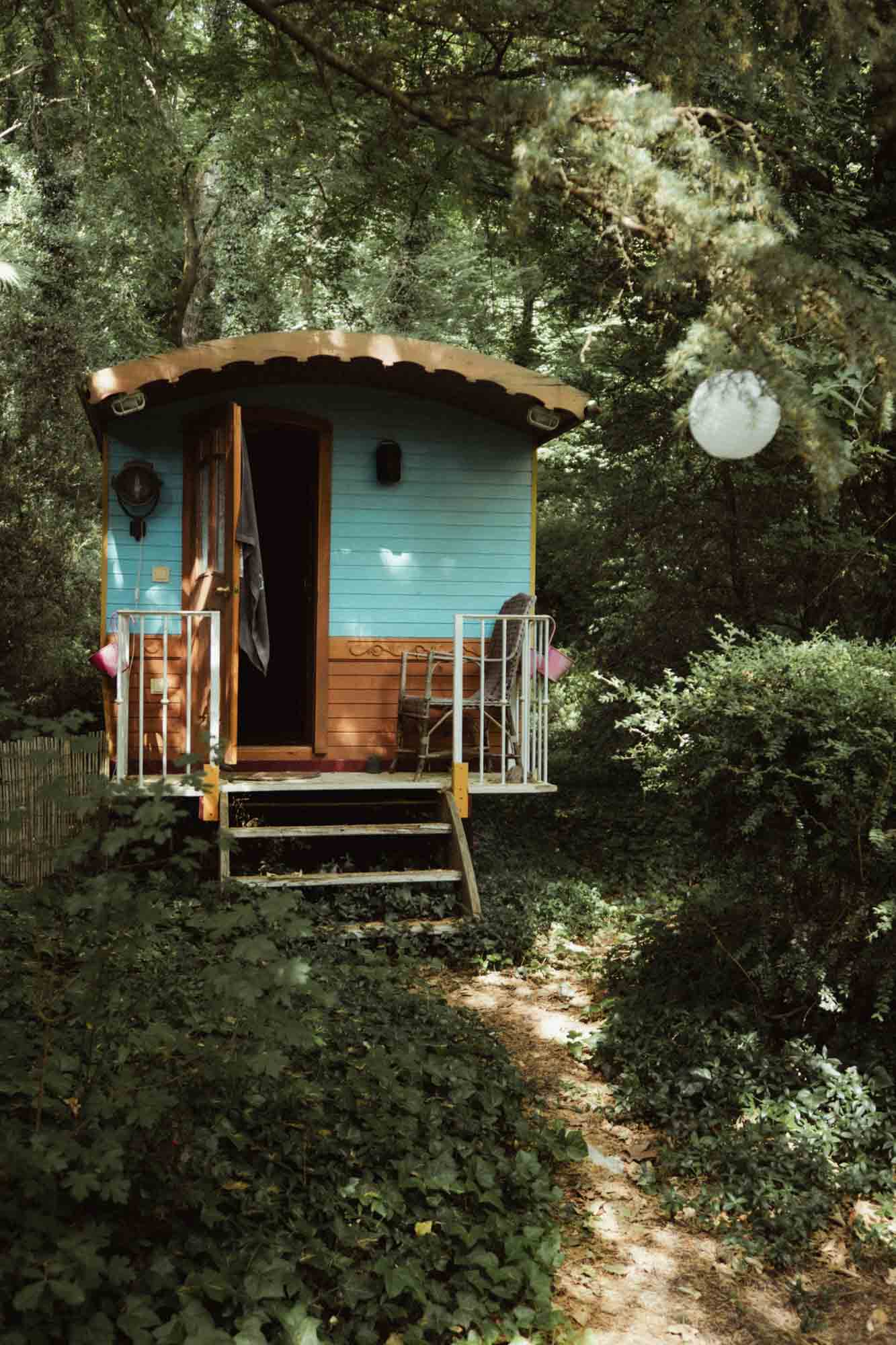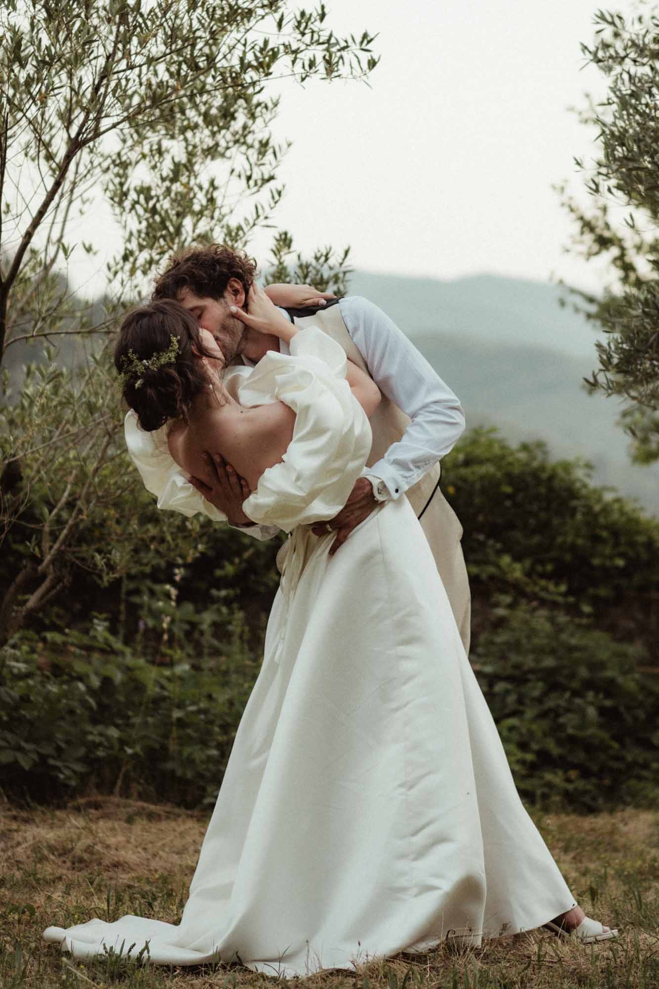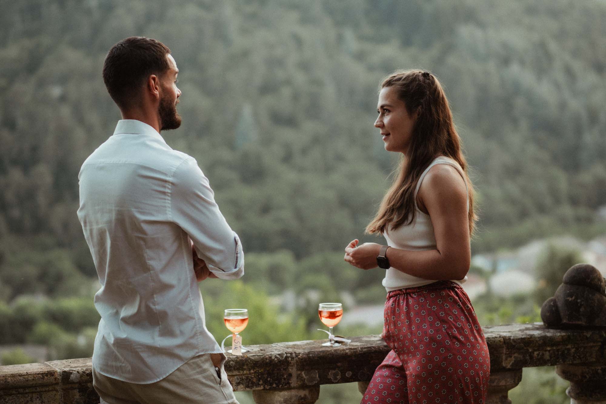 Après la cérémonie, j’ai réalisé des photos de groupes et de cocktail puis de l’échange des vœux des mariés, réalisé à l’écart en toute intimité. Pour les photos de couple, j’ai mis à profit la devanture d’une jolie roulotte aménagée qui sert à l’un des membres de la famille lorsqu’il se rend sur place. Vibe boho garantie (j’adore évidemment) ! On a aussi profité du jardin et de la vue magnifique qu’il offre. Le traiteur ayant apporté un plateau pour les mariés pile à ce moment-là, j’ai décidé de l’intégrer pleinement à la séance en les faisant s’asseoir sur un petit muret pour le savourer. C’est une idée que je me félicite d’ailleurs d’avoir eue car j’ai réalisé certaines photos parmi mes préférées de mon portfolio mariage (on m’a même dit sur Instagram qu’il y avait un petit effet “tableau de la Renaissance”, la fierté absolue). Un peu plus tard, j’ai aussi profité de leur installation de guirlandes lumineuses dans un grand arbre du jardin pour les placer au milieu : une ambiance différente mais qui me plaît beaucoup aussi ! J’ai été d’ailleurs très heureuse que certaines de mes photos préférées de ce reportage se soient retrouvées dans la sélection de tirages réalisée par les mariés.
