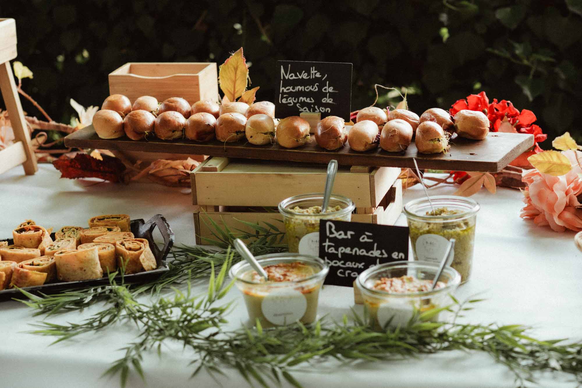 Le buffet dinatoire a débuté ensuite dans une ambiance de type guinguette, ce qui est toujours particulièrement plaisant à photographier (très photogénique avec les petites lumières en arrière-plan). J’ai apprécié la sensibilité des mariés vis-à-vis du zéro déchet : ils avaient en effet choisi de faire appel au traiteur Boc & co. Le buffet était canon en plus d’être sain et respectueux de l’environnement (et je crois que les invités ont été ravis !).